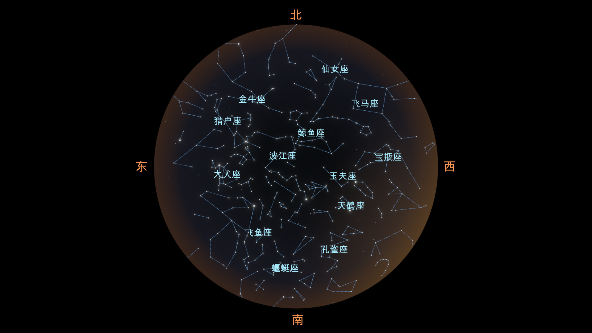 在南半球,11月则可观测到一些较小但有趣的星座,如玉夫座、凤凰座、杜鹃座和水蛇座,这些星座在夜空中位置良好。同时,这也是欣赏鲸鱼座的最佳季节之一——它是天空中最大的星座之一,在夜晚高高升起。