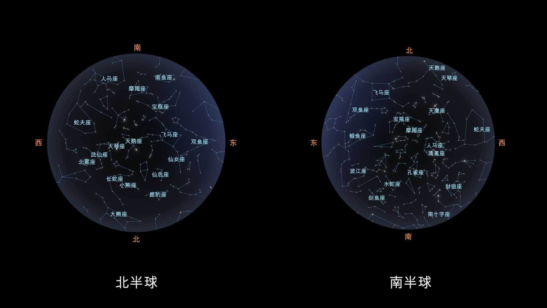 在9月,南北半球都能欣赏到一些著名星座。在黄道带上,可以看到黄道星座:双鱼座、宝瓶座、摩羯座和人马座,这些在两半球都十分醒目,而天蝎座仍然是南半球天空中的亮点。“第十三个黄道星座”蛇夫座在全球范围内也都容易辨认。除了黄道星座外,观测者还可以欣赏到夏季大三角(天鹰座、天鹅座、天琴座),以及逐渐升高的飞马座和仙女座。在北半球的南方天空,还能瞥见南鱼座,其明亮的恒星北落师门在低空中闪耀。