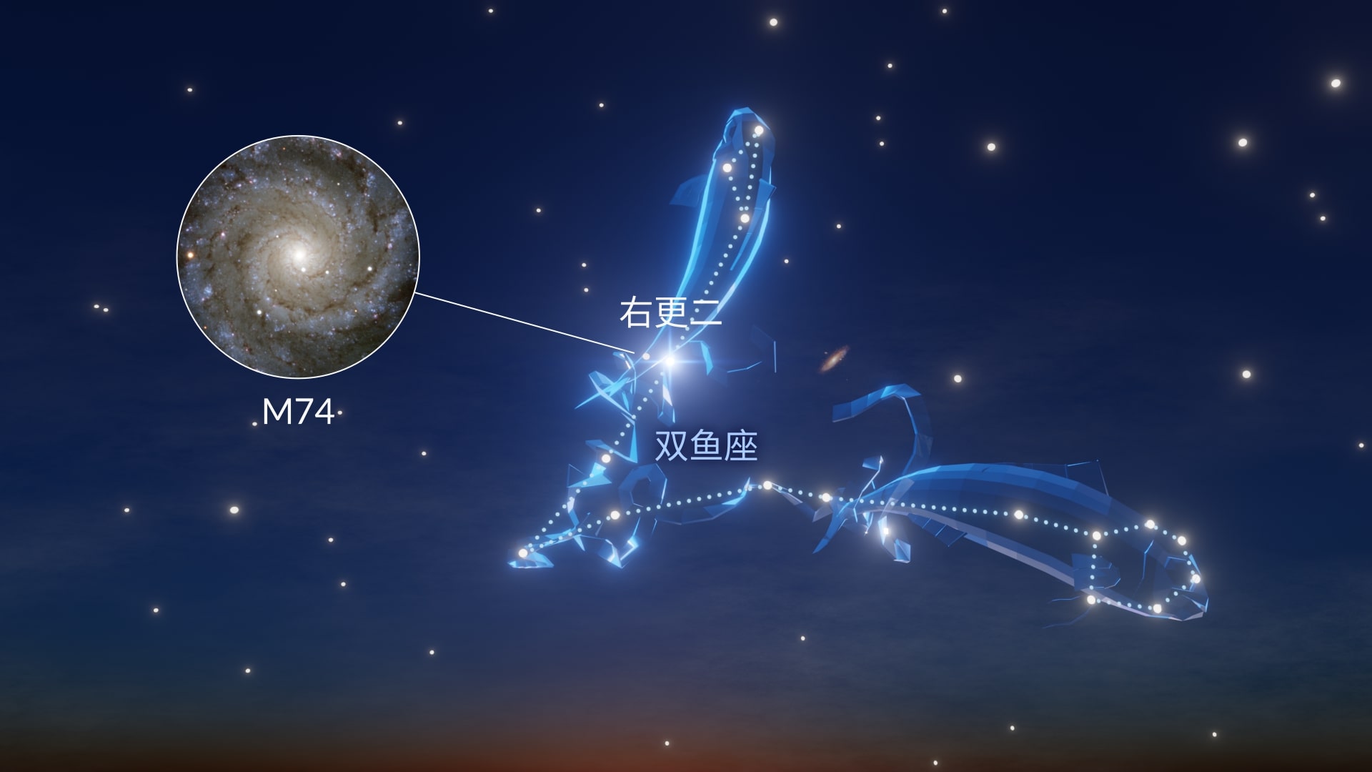 双鱼座较暗,最好在光污染极低的乡村夜空中观测。它位于飞马座大四边形以南,最容易辨认的部分是“圆环”(Circlet)——由七颗暗星组成的紧凑圆环,标志着西鱼的头部。
