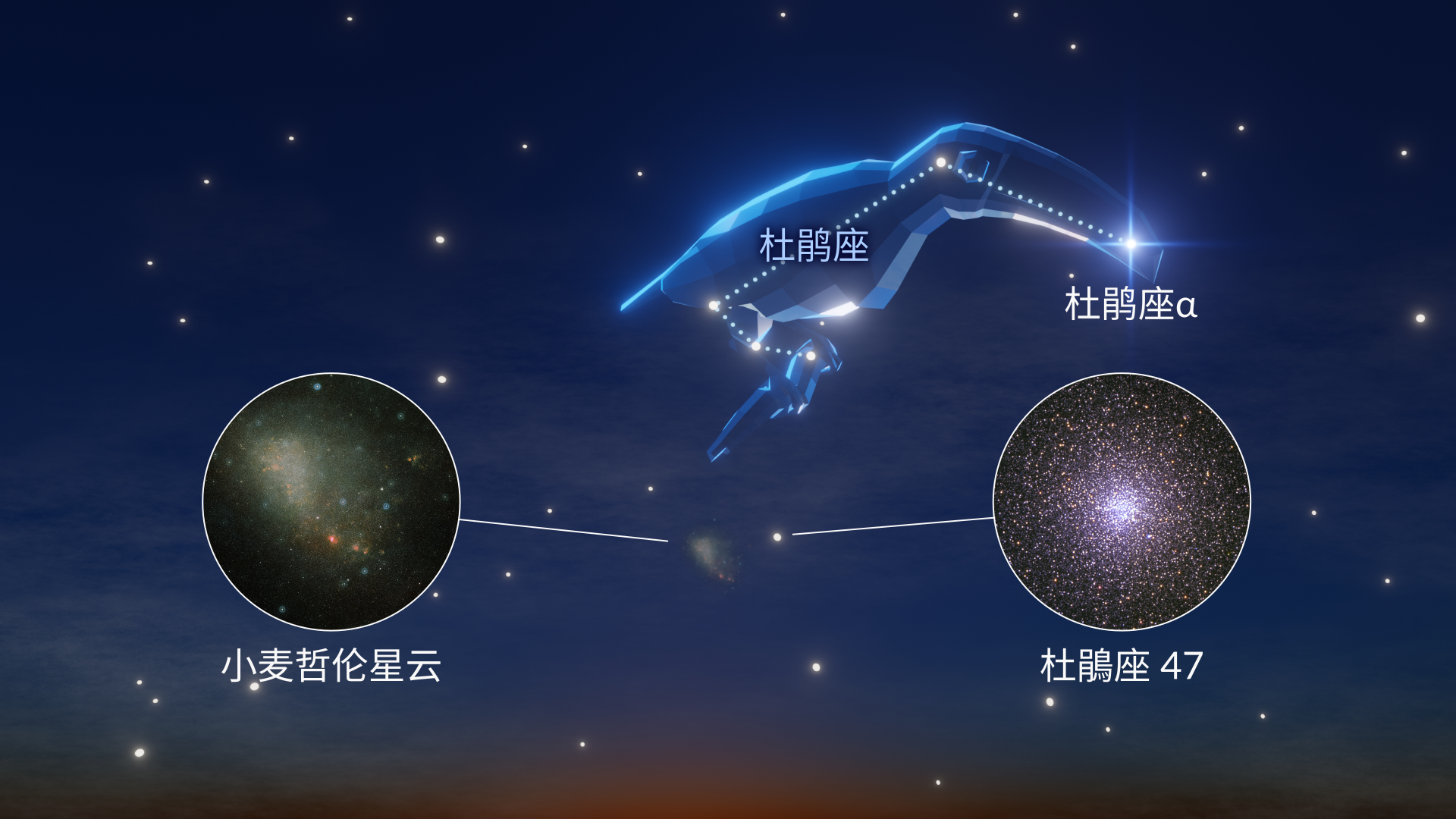 在南方夜空中,朝南方寻找一群暗淡的星星。虽然恒星本身不亮,但杜鹃座容易定位,因为它包含壮观的深空天体:小麦哲伦云(邻近的矮星系)与球状星团杜鹃座47。两者在黑暗夜空中肉眼可见,光芒远超星座本身的恒星。