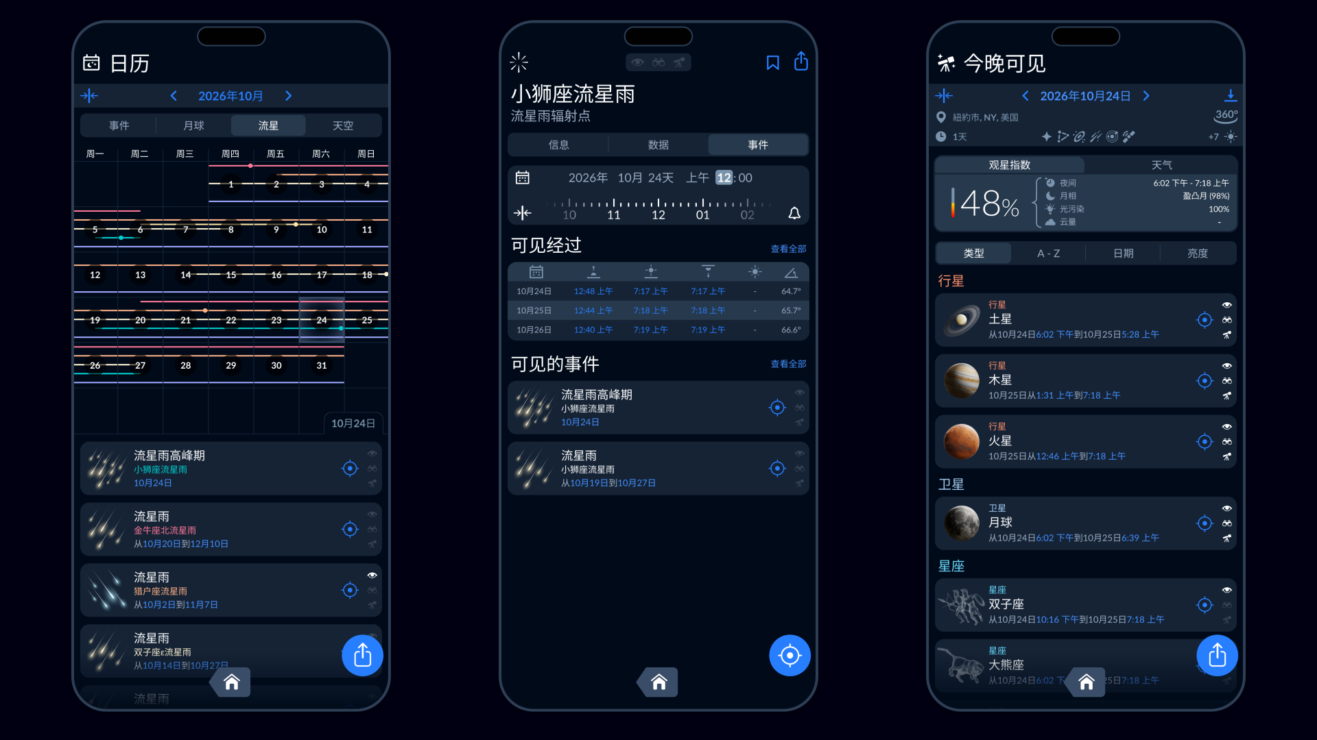 2026年10月将有八场流星雨达到活动极大期,其中包括产流量可观的猎户座流星雨和明亮的天龙座流星雨。使用Sky Tonight应用中的天文日历,了解每场流星雨的极大日期、查看你所在地天空中的辐射点位置,并设置提醒,不错过最佳观测时机。此外,还可以阅读本文,了解最新的流星雨资讯!