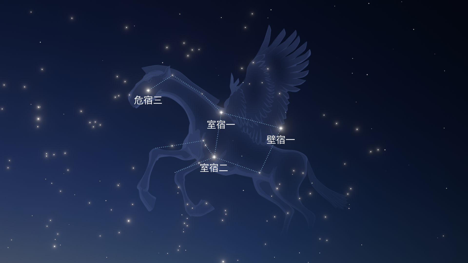 - 在中国传统天文学中,飞马座并未被视为一个单独的星座,其恒星被划分到北方玄武区域内的多个较小星官之中。
