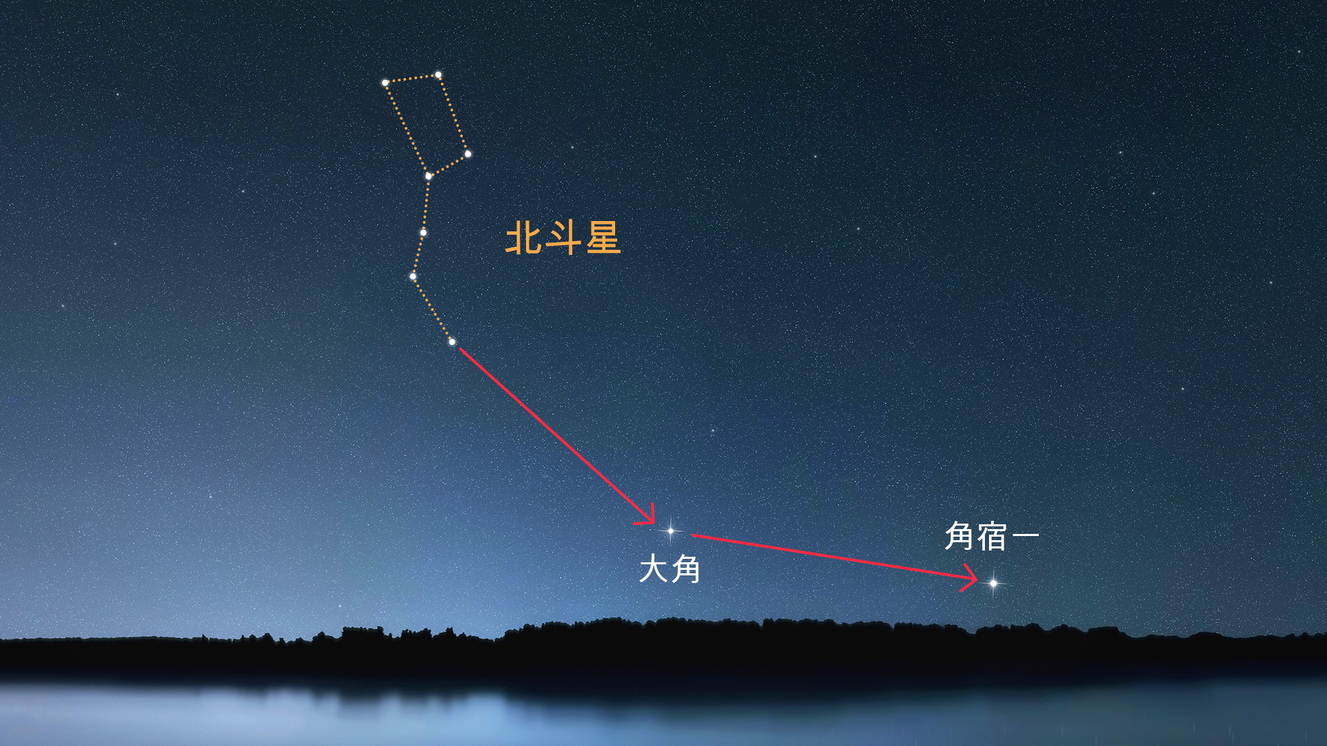 定位角宿一的一种方法是使用北斗七星,它是天空中最容易辨认的星群之一。延伸北斗“手柄”的曲线找到大角星,然后继续大致延伸到角角一。