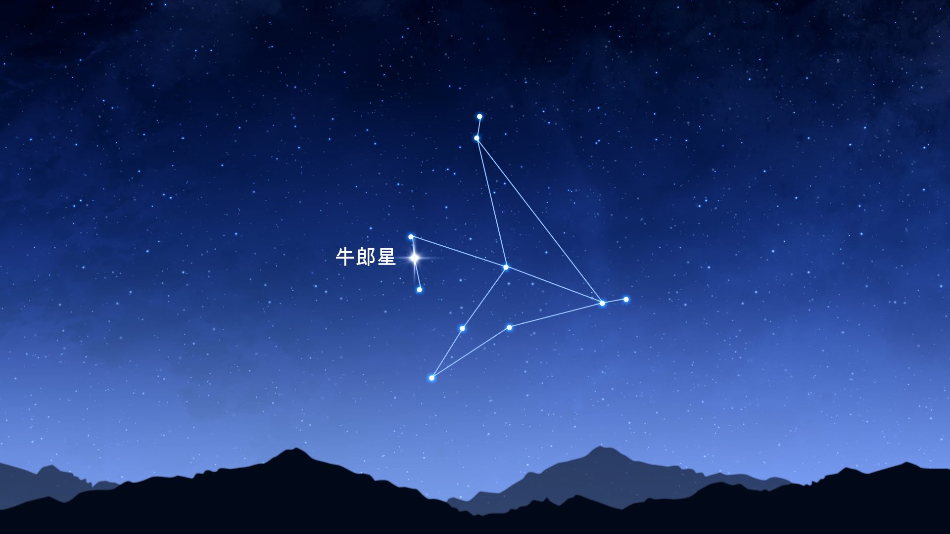 大三角形最南的顶点是由牛郎星标志的。星座内它是指飞行老鹰的头。牛郎星距离太阳系16.7光年,同时是离我们最近的星星之一。它离地球如此之近,以至于它的表面已经成像!而牛郎星星的自转速度非常高,比太阳快100倍。
