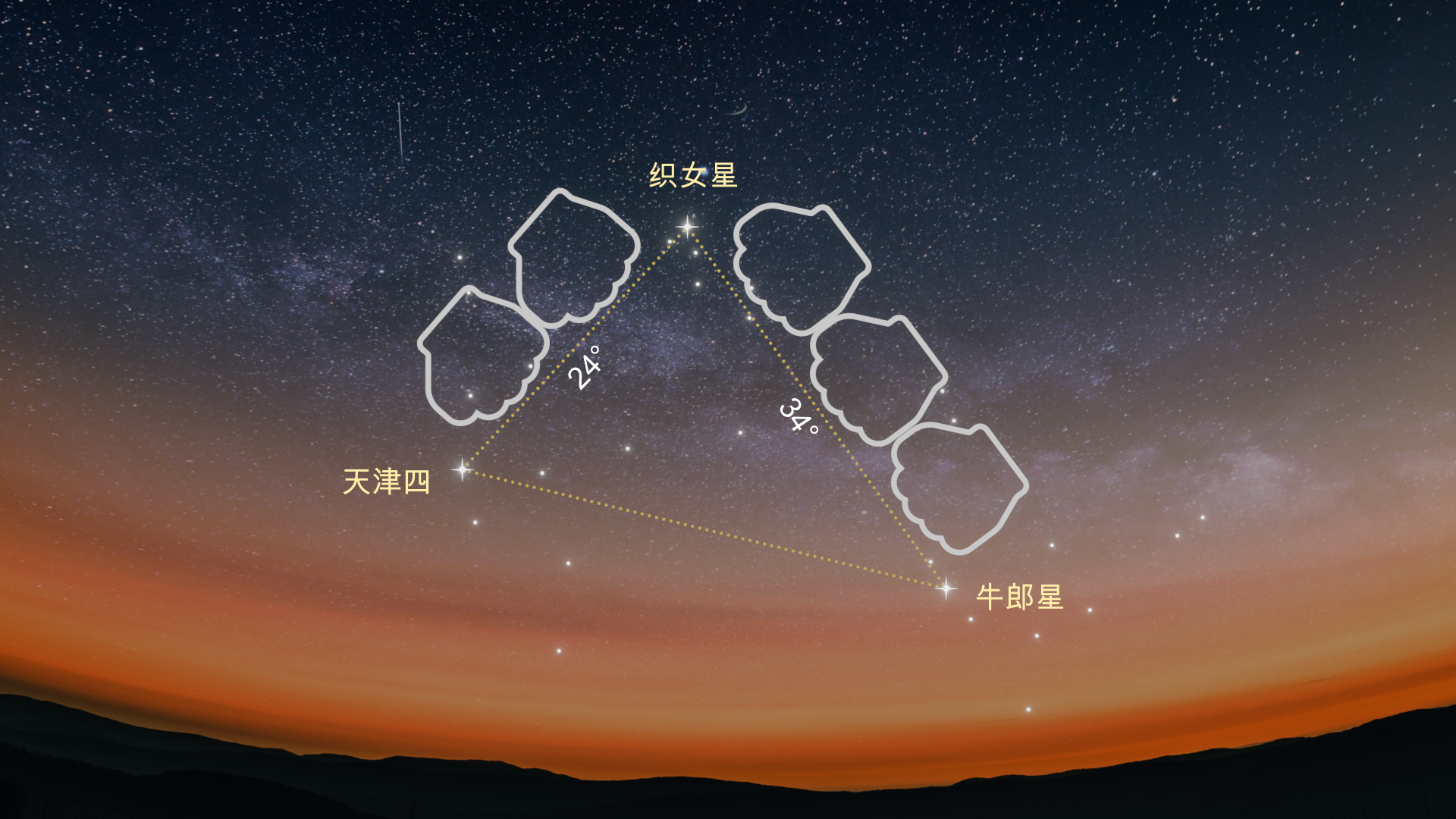 织女星的右下角是天鹰座最亮的恒星 牛郎星(0.77 星等)。它们之间的距离是34度(比织女星到天津四的距离多一个握紧的拳头)。