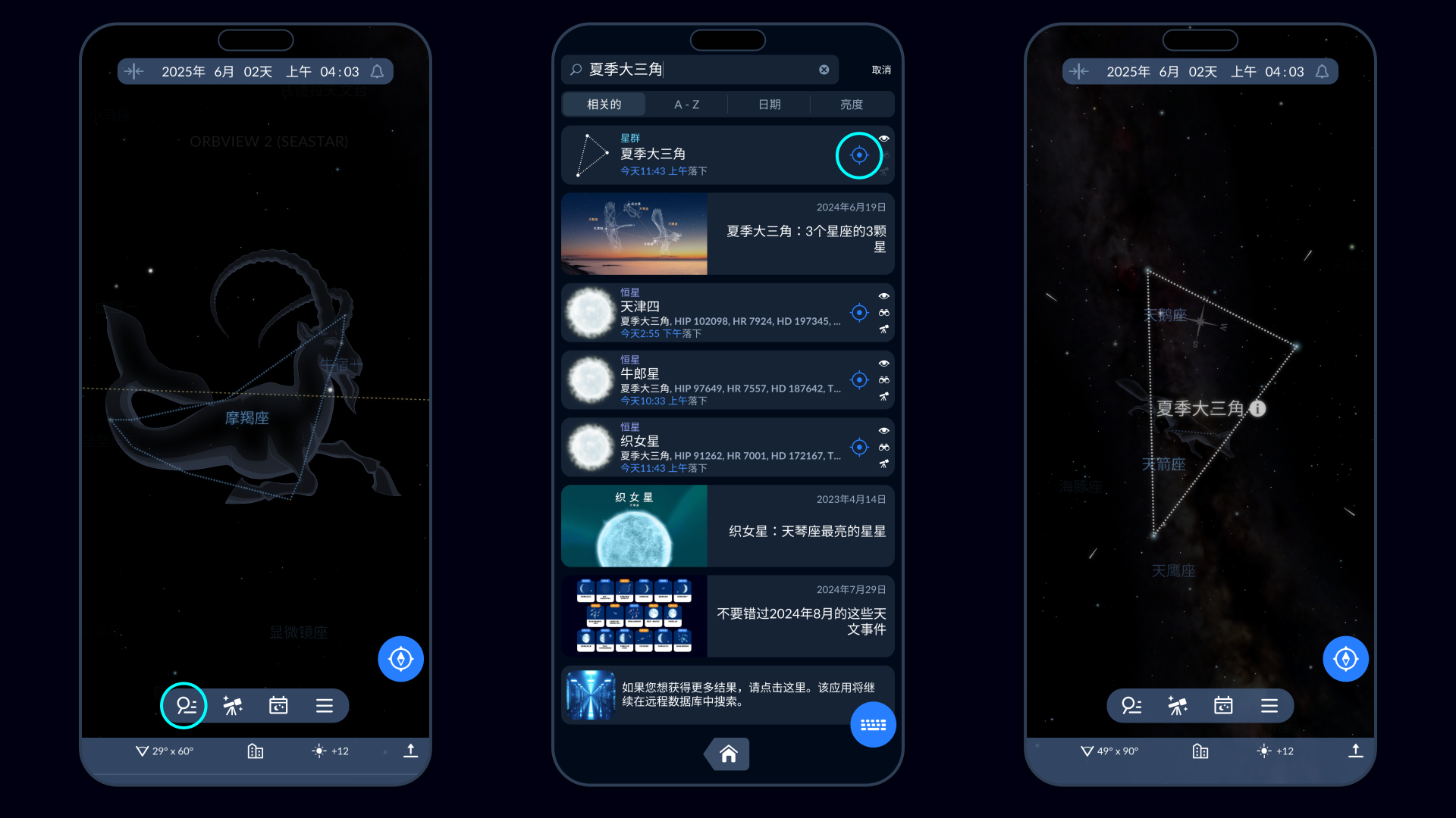 仅此而已!连接这三个点,您就会看到夏季大三角。要检查您是否正确识别它,请打开Sky Tonight应用程序并转到搜索窗口。在搜索栏中输入“夏季大三角”,出现相应结果后,点击旁边的蓝色目标图标。该应用程序将向您显示夏季大三角在天空中的位置。将您的设备指向天空,Sky Tonight向您显示星图并跟踪您的移动。