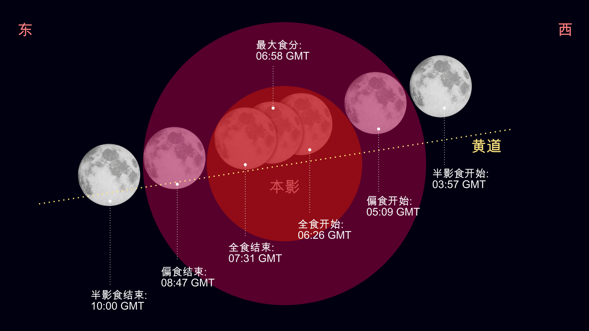 - 月全食开始于GMT时间06:26;