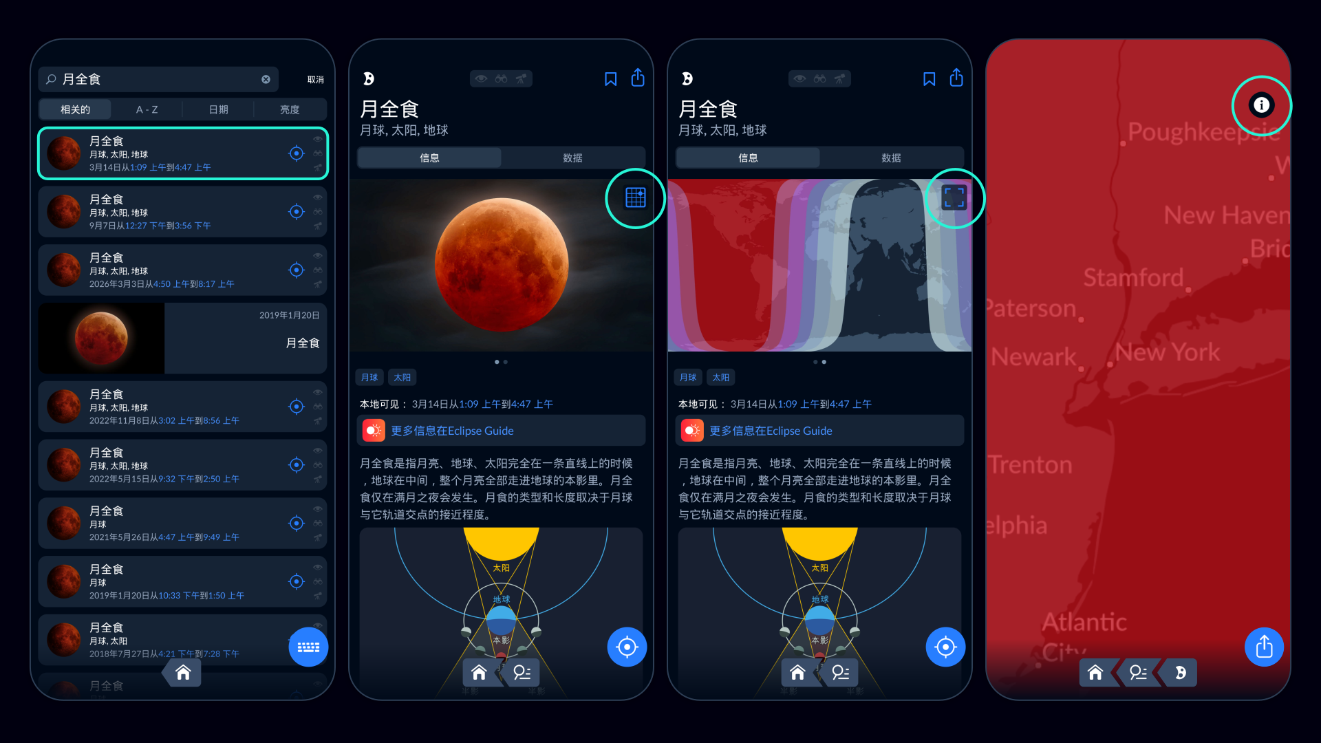 该应用还提供精准的月食时间(按所在时区)、最佳观测地点等信息。你甚至可以设置闹钟和通知,确保不错过这一重要时刻!