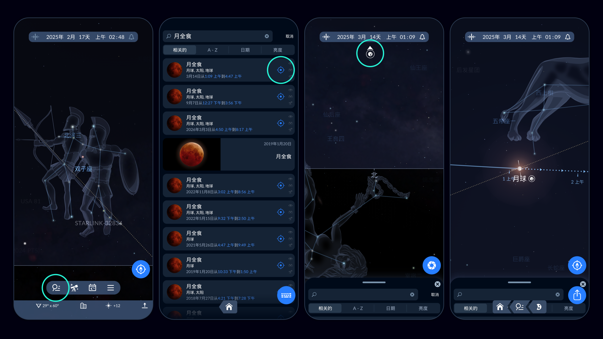 如果想知道月食期间月亮在天空中的具体位置,点击目标按钮。要让手机屏幕上的星空与现实天空匹配,点击指南针按钮,并跟随白色箭头,直到月亮出现在屏幕上。记住月亮的位置,并提前计划好您的观测之夜!