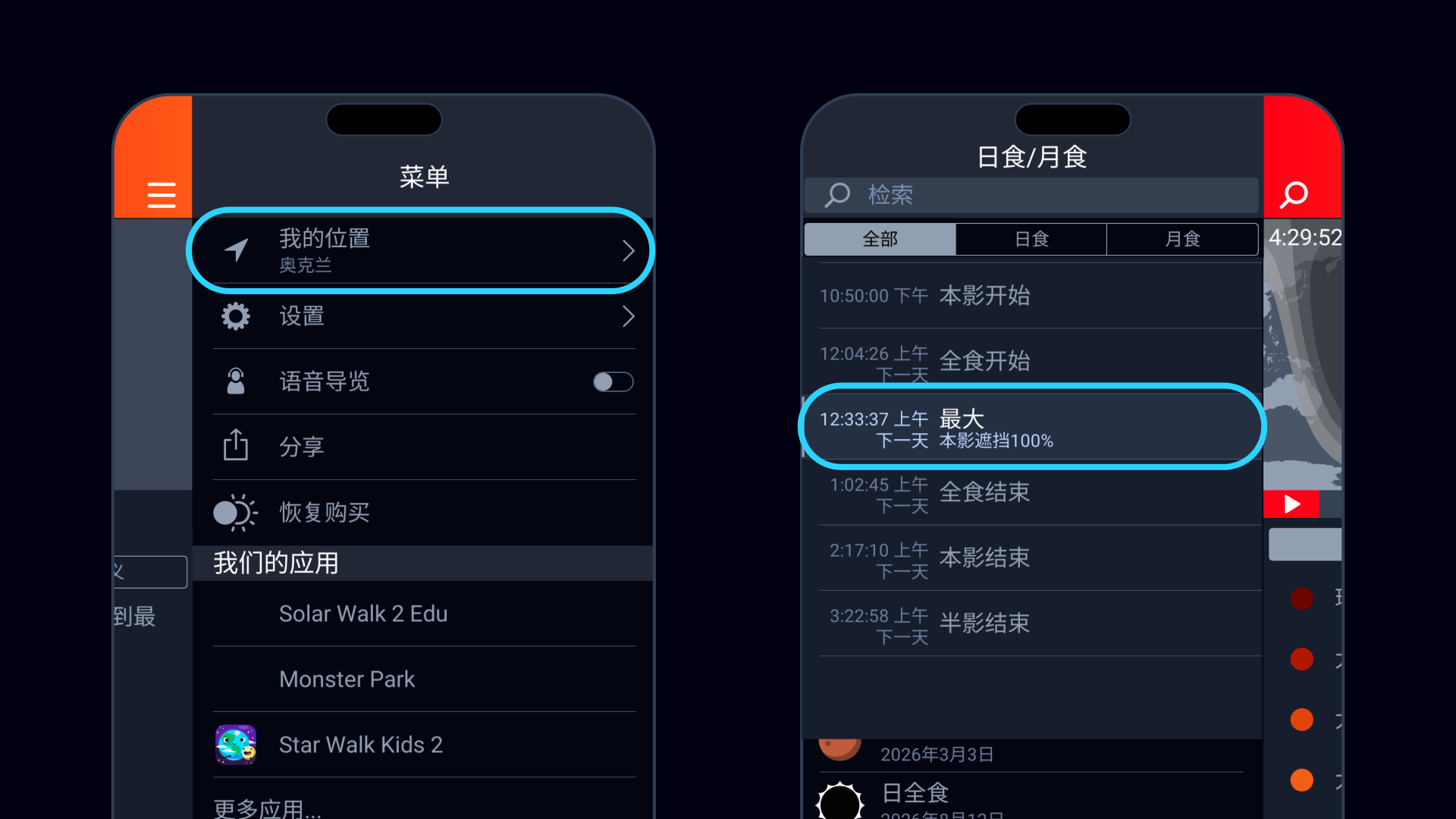 - 打开应用,点击右上角的菜单图标并选择你的位置。选定位置后,Eclipse Guide将自动计算并显示与你所在位置对应的精确时间和各个关键阶段的持续时长——从不易察觉的半影阶段,到全食和食甚——无需手动换算时区。
