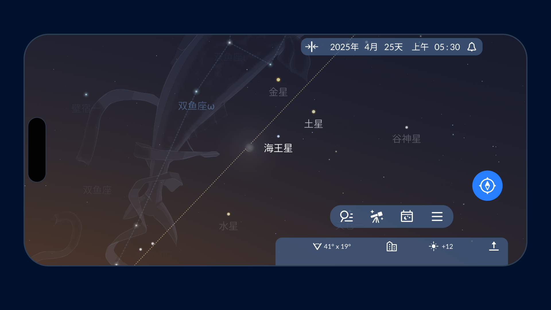 2025年4月下旬是观测金星的最佳时机! 它将以惊人的-4.8等闪耀天空,与月亮、土星、水星和海王星一同点亮拂晓时分的东部天际。日出前寻找那颗最耀眼的“晨星”吧!想要更轻松地定位金星和周围天体,记得使用免费的天文应用程序Star Walk 2。