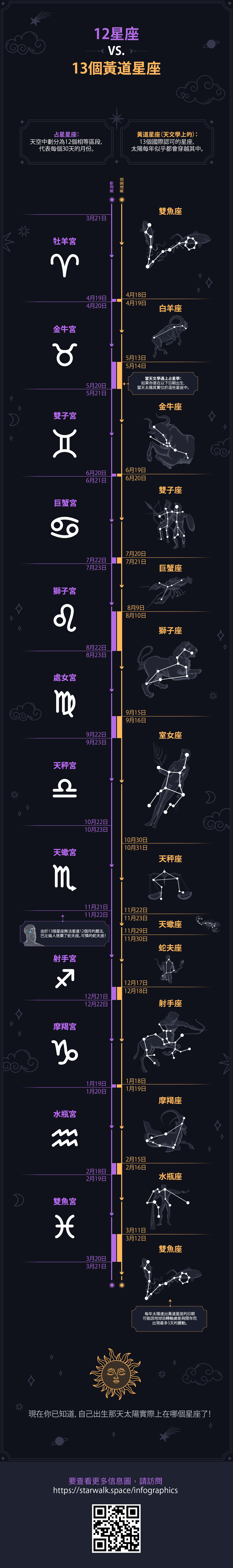 此外,隨著時間推移,實際星座(即黃道星座)的邊界也發生了變化,這些星座與傳統星座大致對應。因此,太陽實際通過這些星座的日期,與占星學中的星座日期有很大差異。透過這張資訊圖,你可以了解古老的黃道系統與現代黃道星座之間的差別,並找出你出生那天太陽實際所在的位置。想深入了解你的星座是否有科學根據,請參考我們的專題文章。