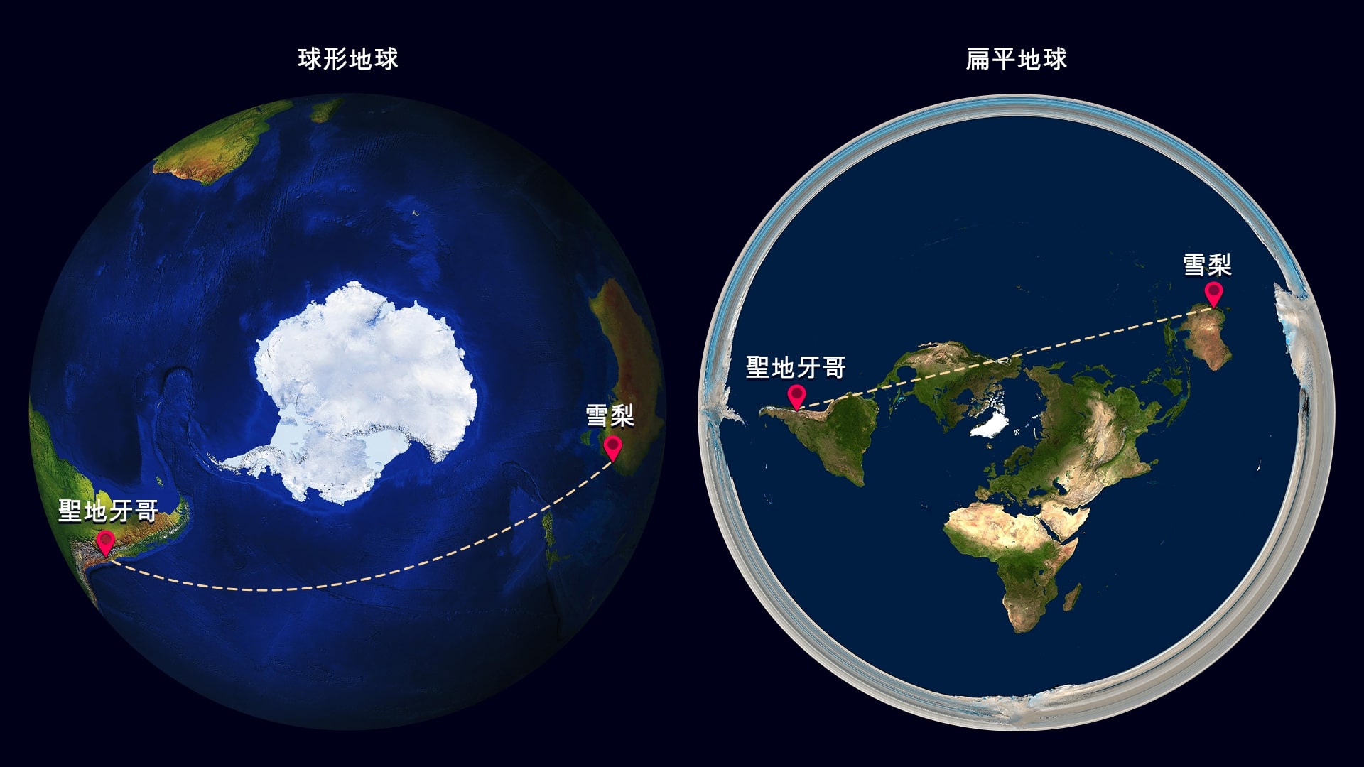 例如,讓我們看看從智利聖地亞哥飛往澳大利亞悉尼的航班。在平坦的地球上,最短的路線是這樣的:飛機應該飛越整個南美洲、整個北美洲,然後才越過海洋到達悉尼。真正的飛機使用哪種飛行航線? 隨便google一下,你會發現商用飛機只需要越過太平洋從聖地亞哥飛到悉尼。如果你不相信谷歌,你可以自己坐一次這樣的航班,看看飛機窗外,飛行的時候試試發現北美在下面。