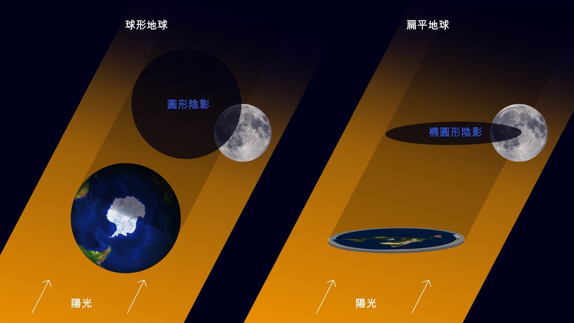 如果地球是平的,那麽它在月球上的陰影會根據太陽光線的角度而有所不同。在月食期間,我們經常看到的不是完美的圓形陰影(只有當太陽直接位于平坦地球下方時才會出現),而是橢圓形的陰影。然而,每次我們都觀察到一個圓形的陰影——這正是球形行星所應有的。