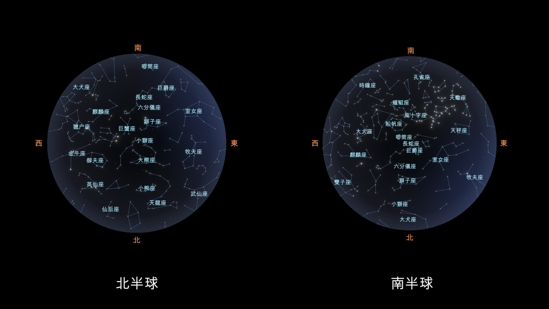 - 南半球:長蛇座、巨爵座、唧筒座、蝘蜓座