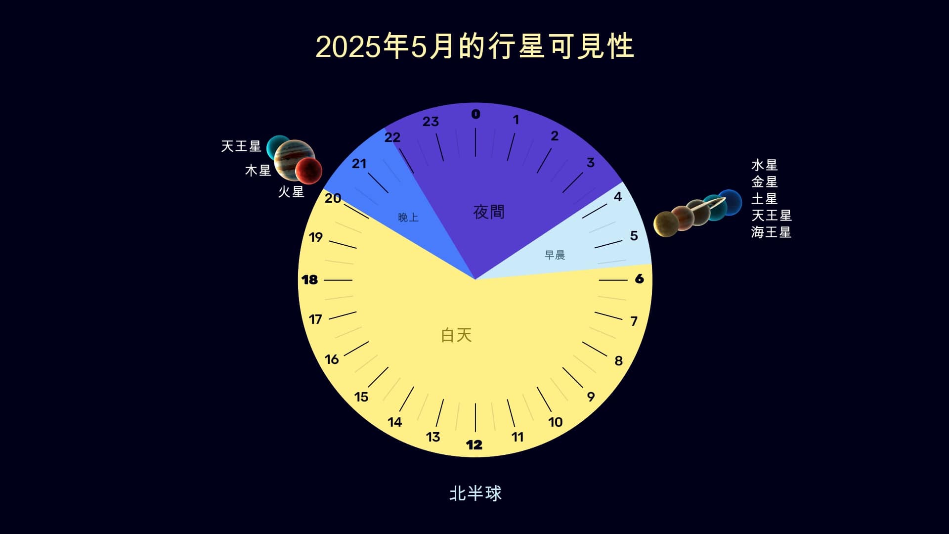 水星:在5月初的清晨可見于東北方低空,黃昏時也會低懸于地平線上。隨著時間推移,水星將從雙魚座移至白羊座,但因逐漸靠近太陽,其可見性越來越差。到5月中旬,它會完全隱沒在太陽的耀光中,並于5月30日與太陽發生上合。在整個5月,水星的亮度從0等提升至-2.4等,但觀測難度卻逐步增加。