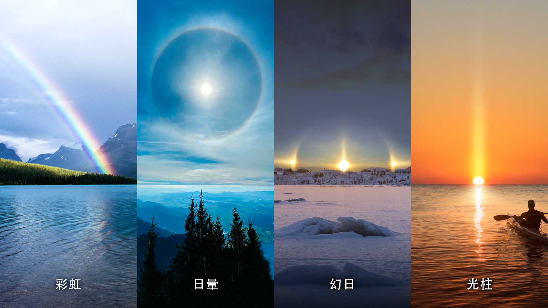 - 彩虹:最常見的光學效果,由光通過水滴的折射引起;
