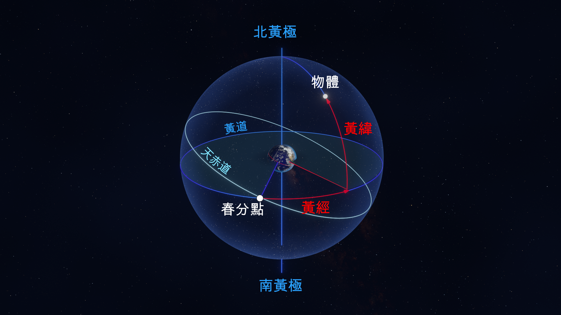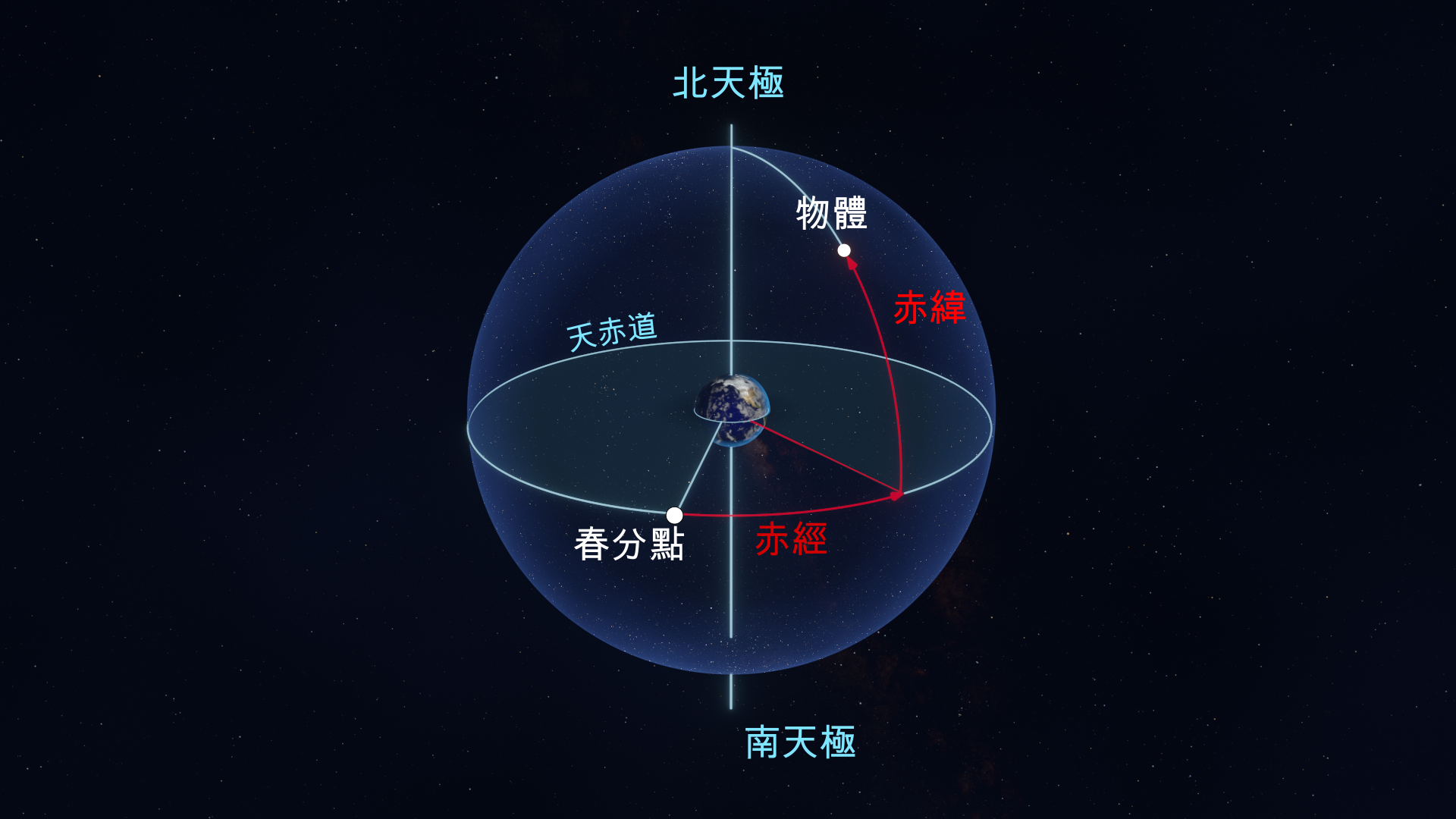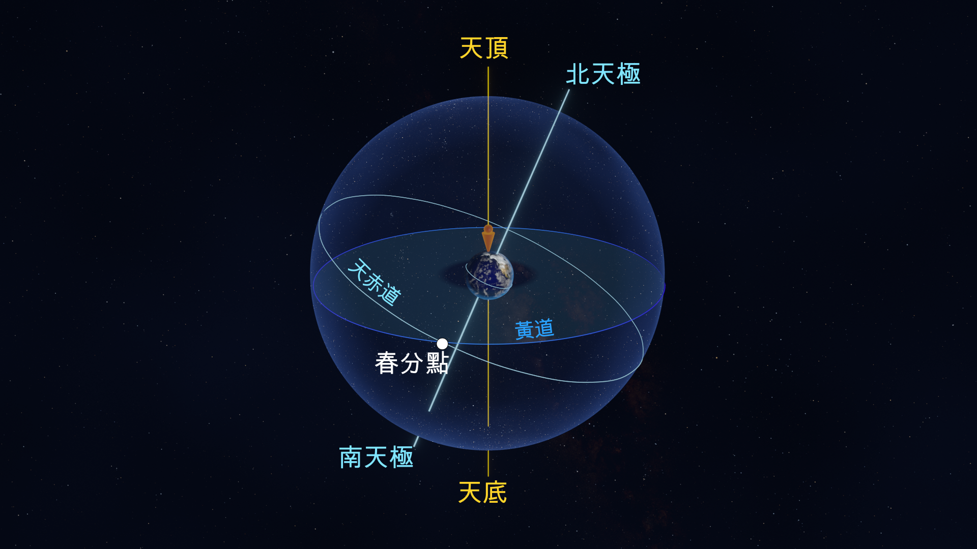 - 天赤道:地球赤道平面與天球相交的圓。就像地球赤道一樣,它將天球分為北半球和南半球。