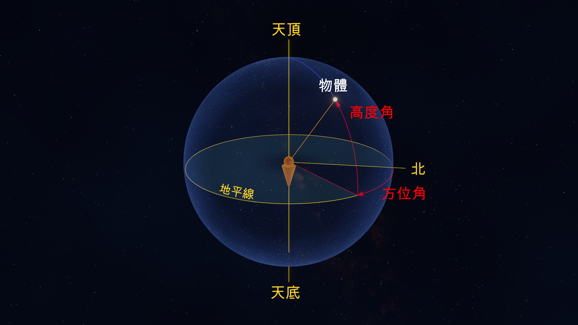 方位角表示物體沿地平線的位置。它是從真北(指向地理北極的方向)順時針測量的度數。例如,如果一個物體的方位角為90°,則它在觀察者的正東方向,而有180°方位角的物體則在正南方向。