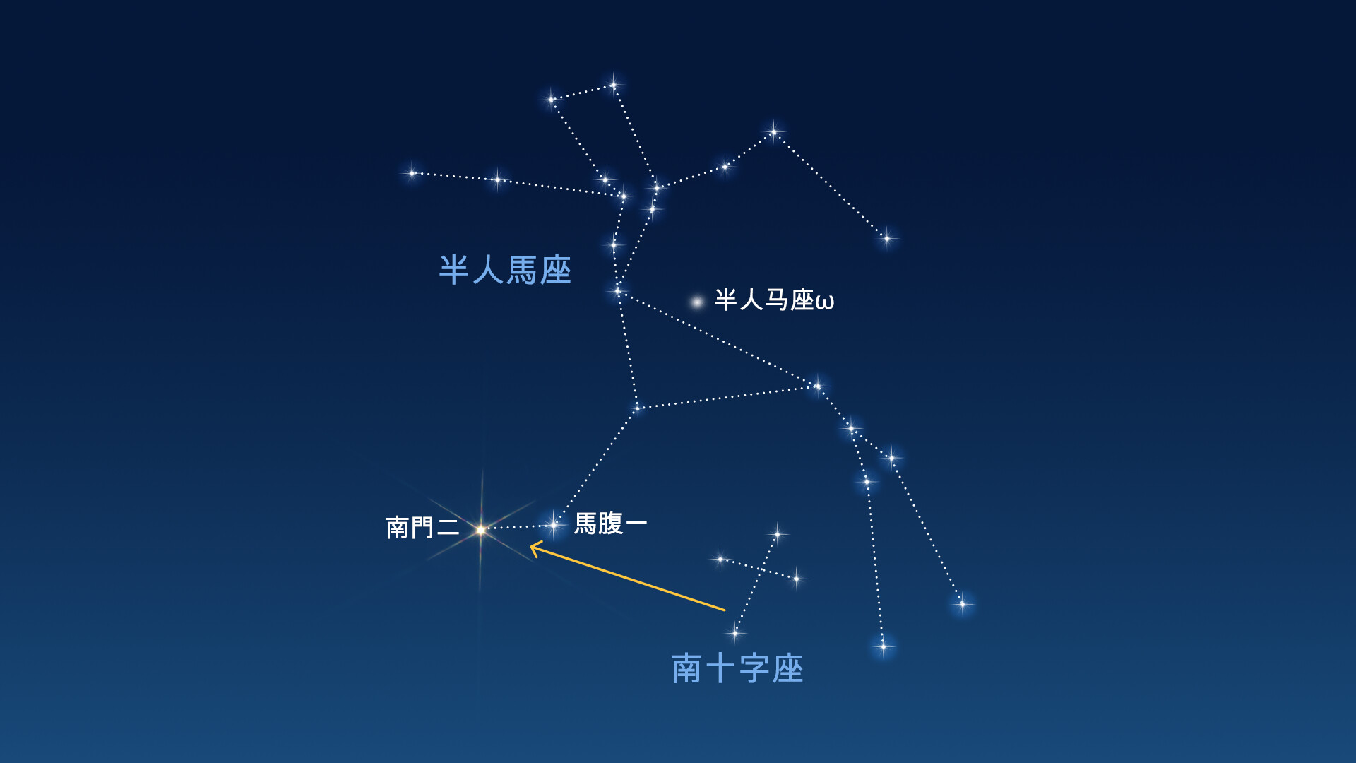要在天空中找到半人馬座,可以從一個容易識別的地標開始:南十字座(Crux)。找到它之後,在附近尋找兩顆明亮的恒星——這就是半人馬座α星和β星。即使在光汙染較嚴重的天空下,它們也很容易被看到,並標示出半人馬後腿的下部。