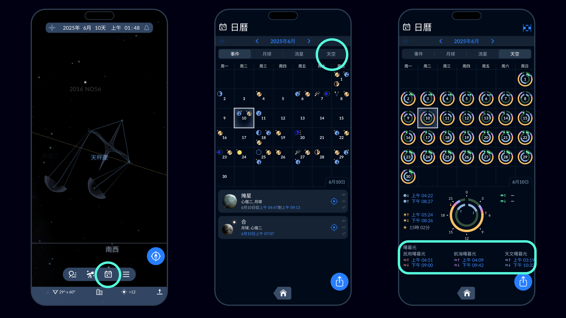 要了解你所在位置的完全黑暗時間,請使用Sky Tonight應用。 打開應用,點擊屏幕底部的日曆圖標,然後選擇“天空”選項卡。Sky Tonight將向你顯示完全黑暗的開始和結束時間及其持續時間。