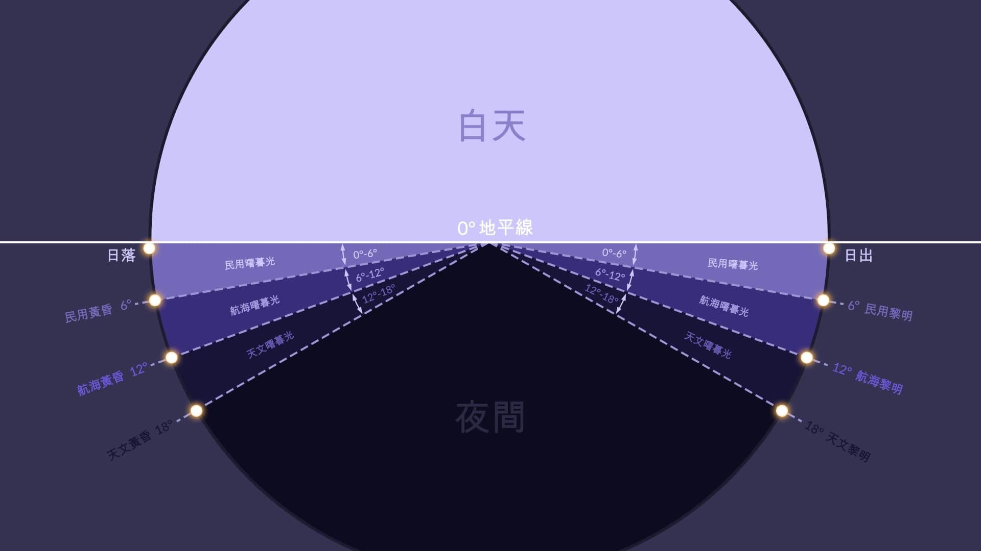 黃昏和黎明是特定的時間點,取決于太陽相對于地平線的位置。就像曙暮光一樣,黃昏和黎明也有三種類型。每個階段太陽的中心在地平線下的位置如下: