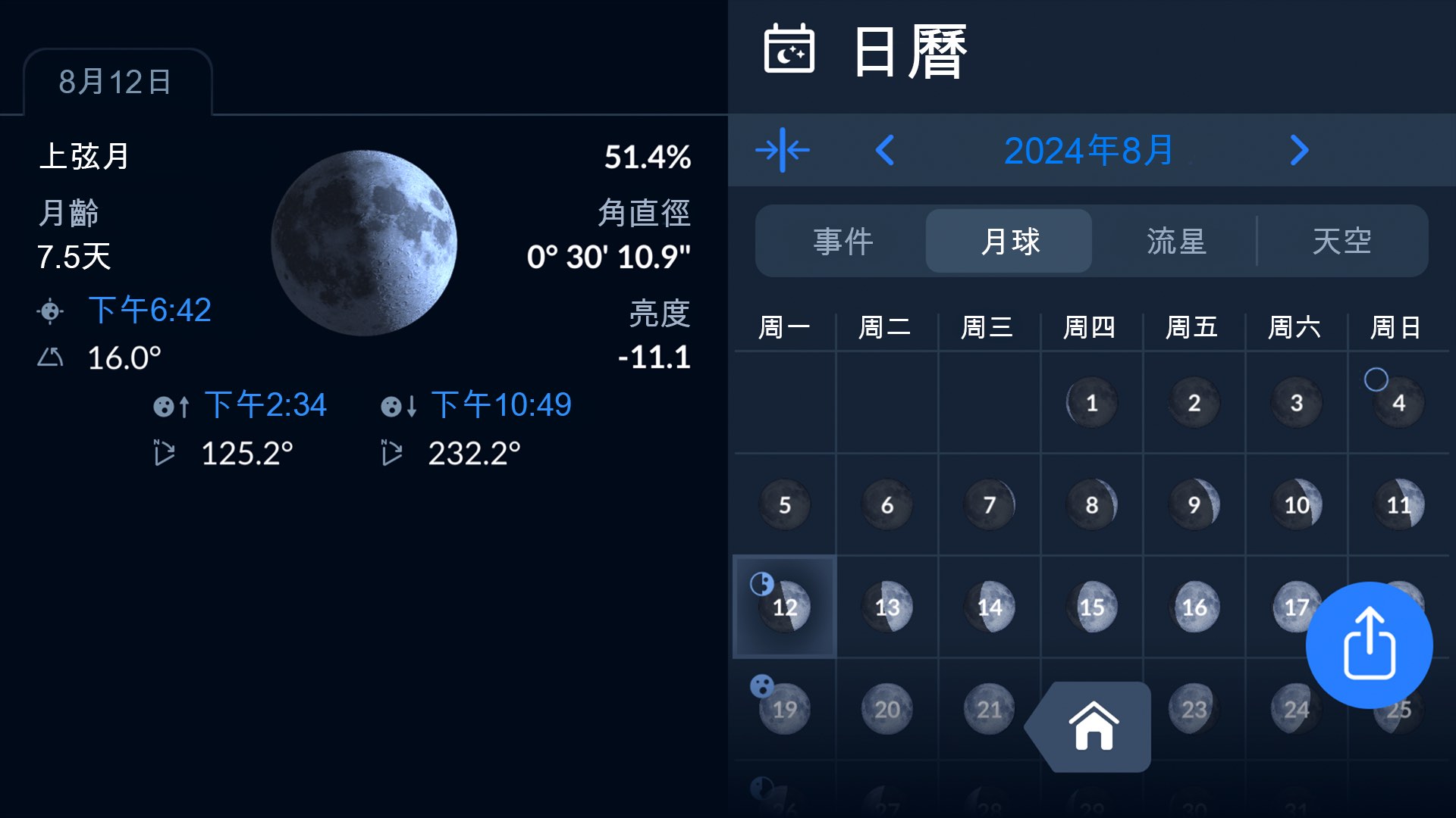 另一種方法是使用Sky Tonight天文APP中的月曆功能。只需點擊主屏幕上的日曆圖標,選擇“月亮”選項卡,然後浏覽日期即可發現詳細信息,例如您所在位置的月相、月亮亮度、月出和月落時間等。月球圖像准確地描繪了我們的天然衛星在您所在位置的任何日期的外觀。親自探索這個功能吧!