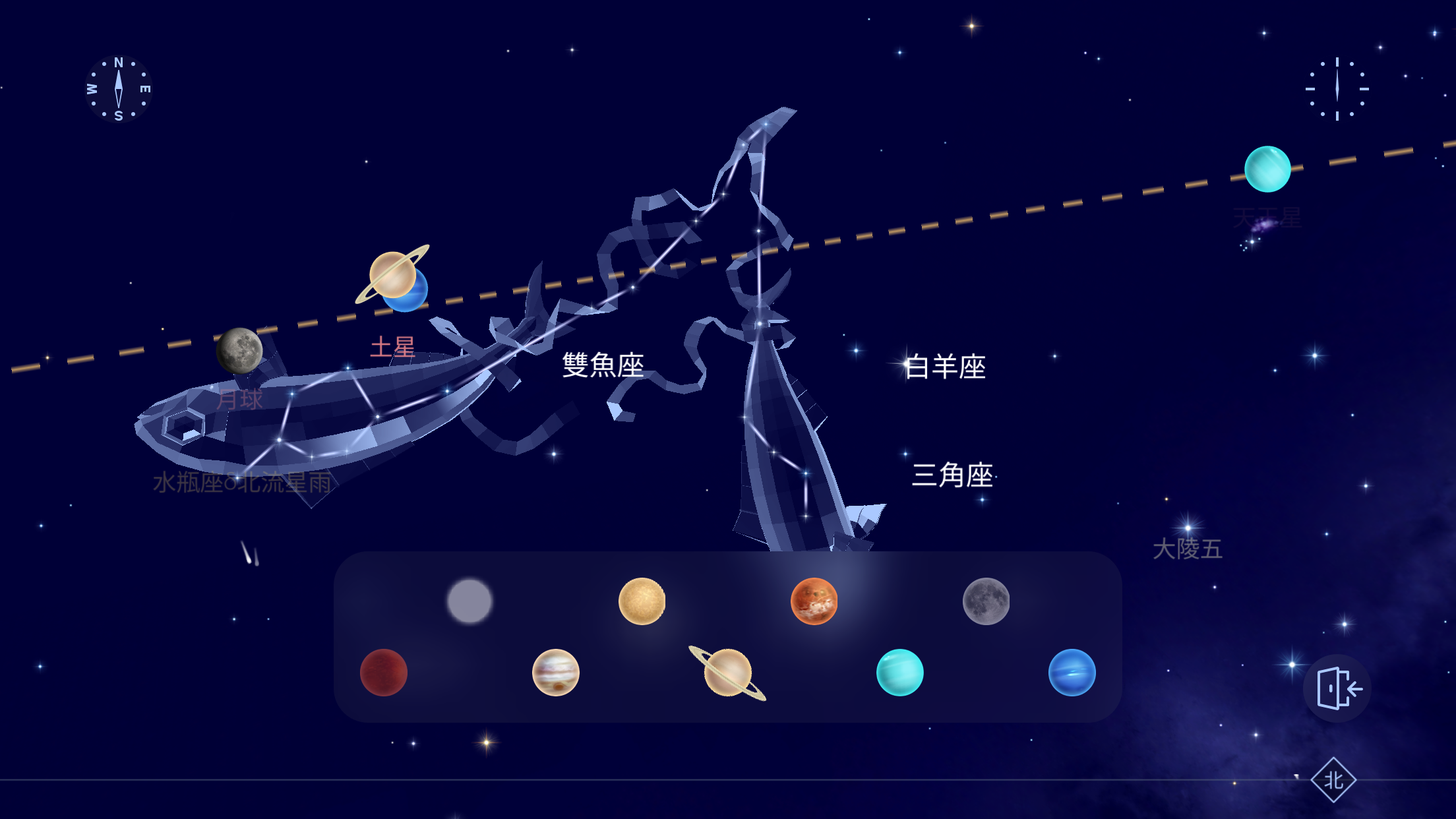 - 海王星(雙魚座):也呈逆行運動。月初從午夜開始可見,隨後到月末可整夜觀測。只能用天文望遠鏡或高倍雙筒望遠鏡探測,亮度維持在7.8等。