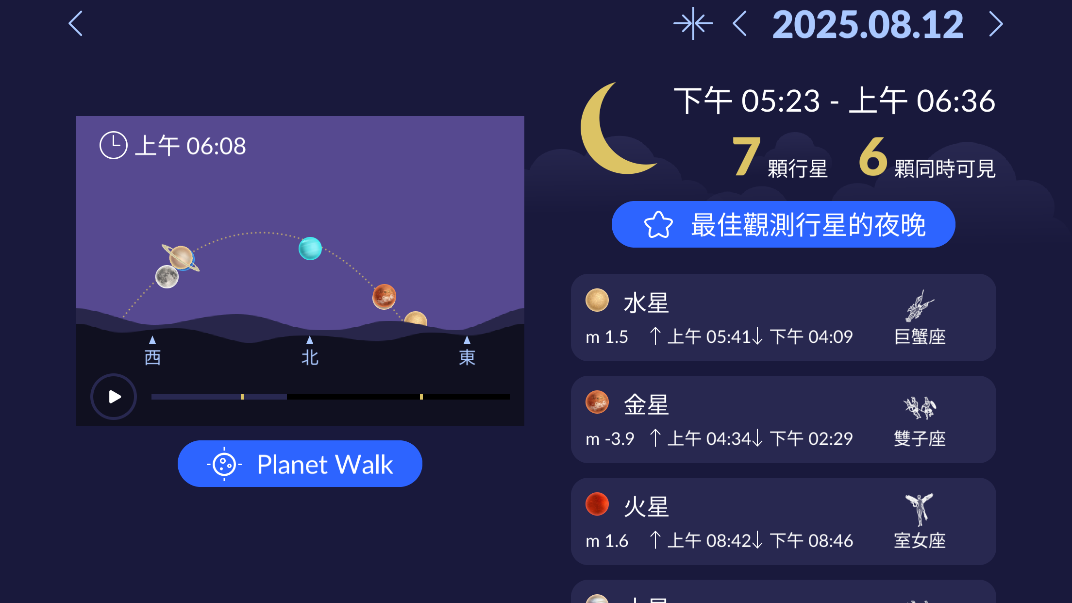 以下是2025年8月行星的可見情況。想知道在任何時間從你的位置可以在哪裏找到行星嗎?請使用免費的 Star Walk 2 應用程序。