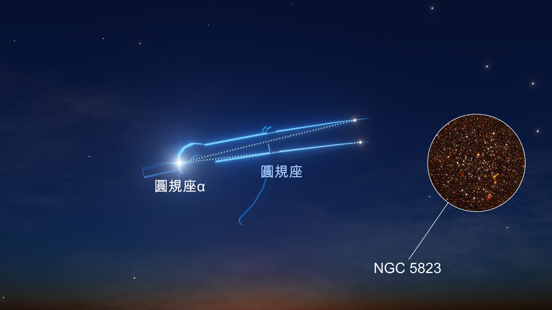 - 最佳深空天體:NGC 5882(視星等6.5)、NGC 5986(視星等8.0)、視網膜星雲(Retina Nebula,視星等10.9)