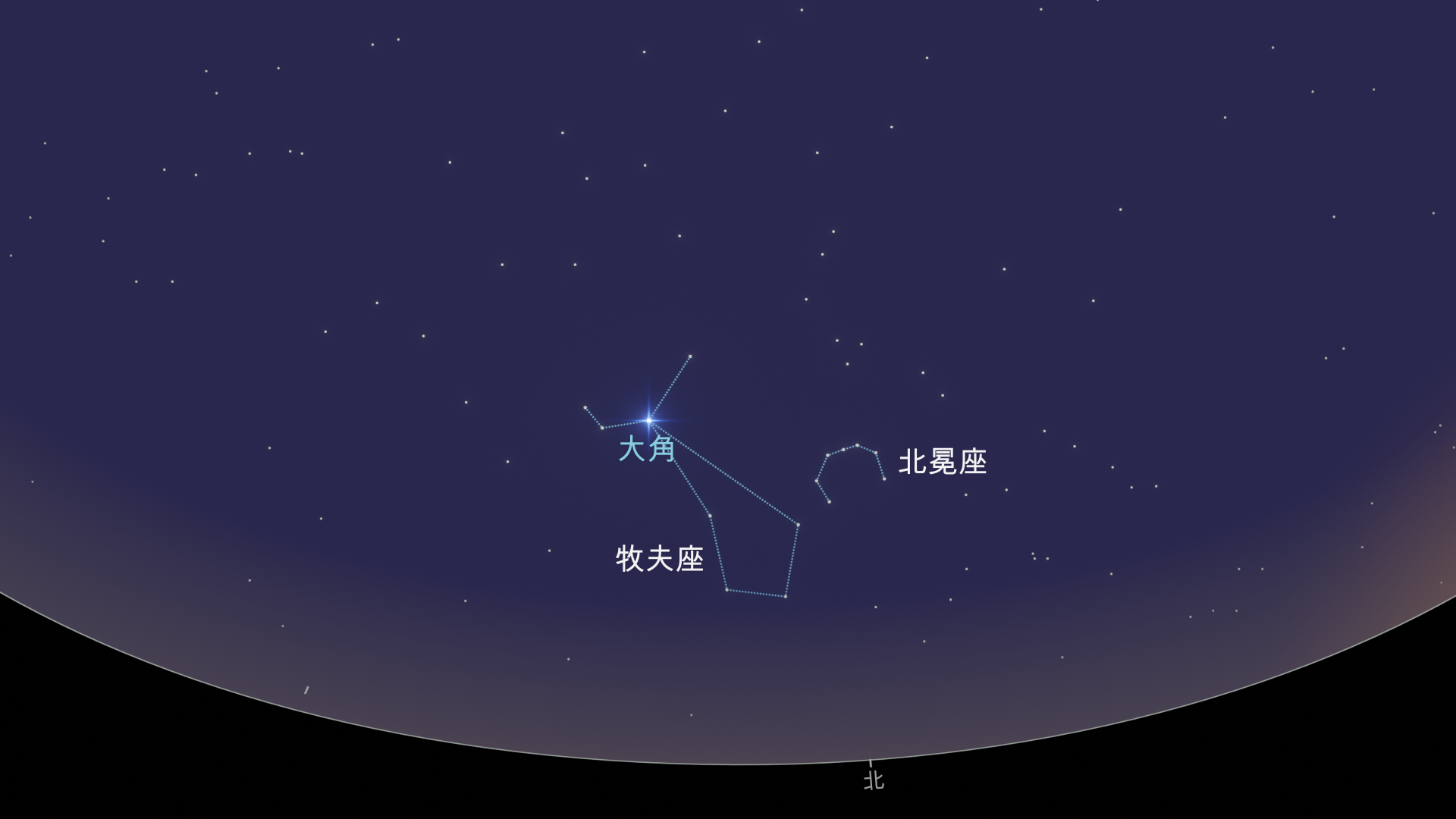 在南半球,大熊座此時在多數地區不可見。請轉向北方地平線,尋找一顆較低且明亮的橙色星星——那就是大角星。位于它下方、呈風筝狀的星群就是牧夫座。