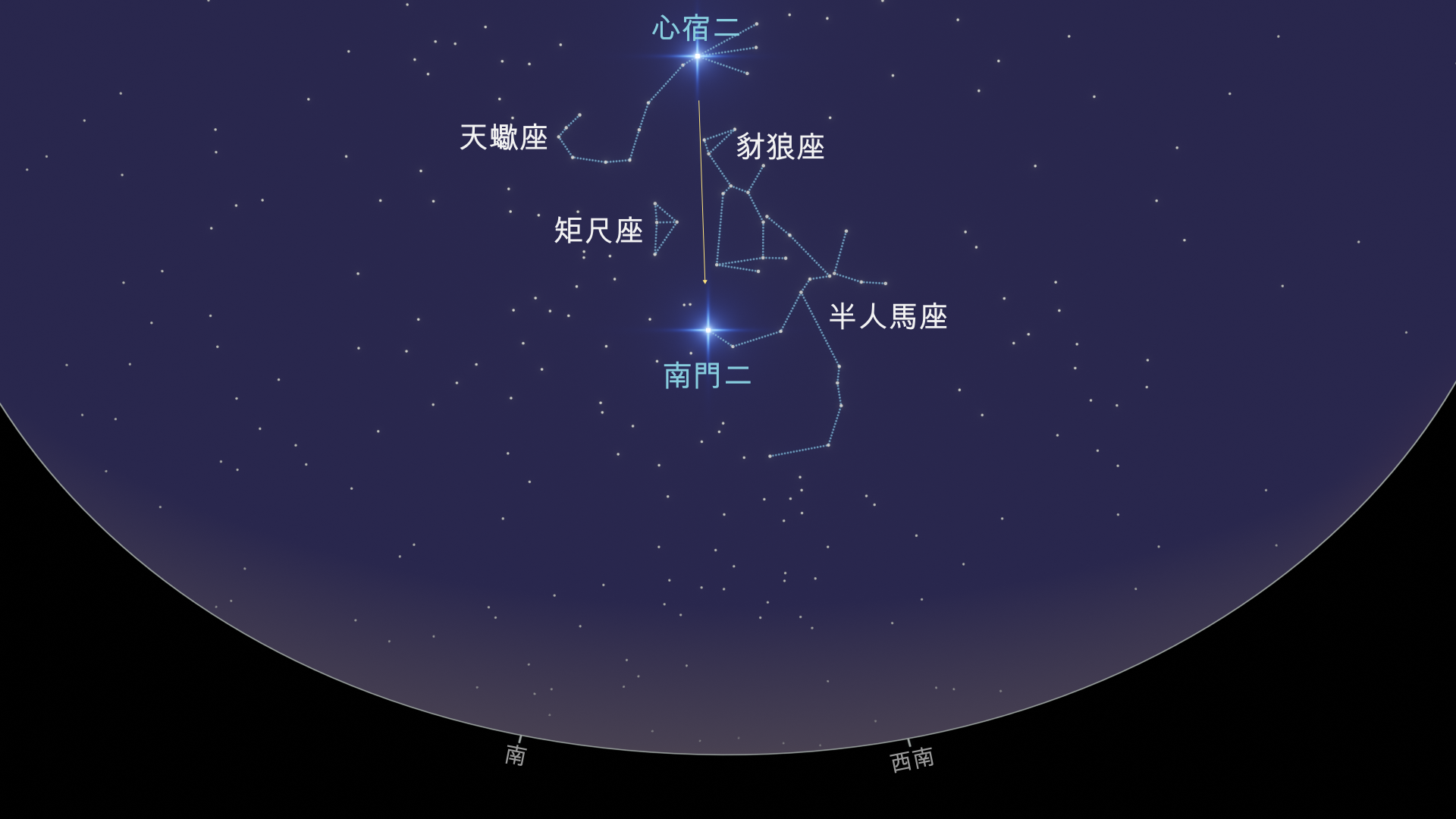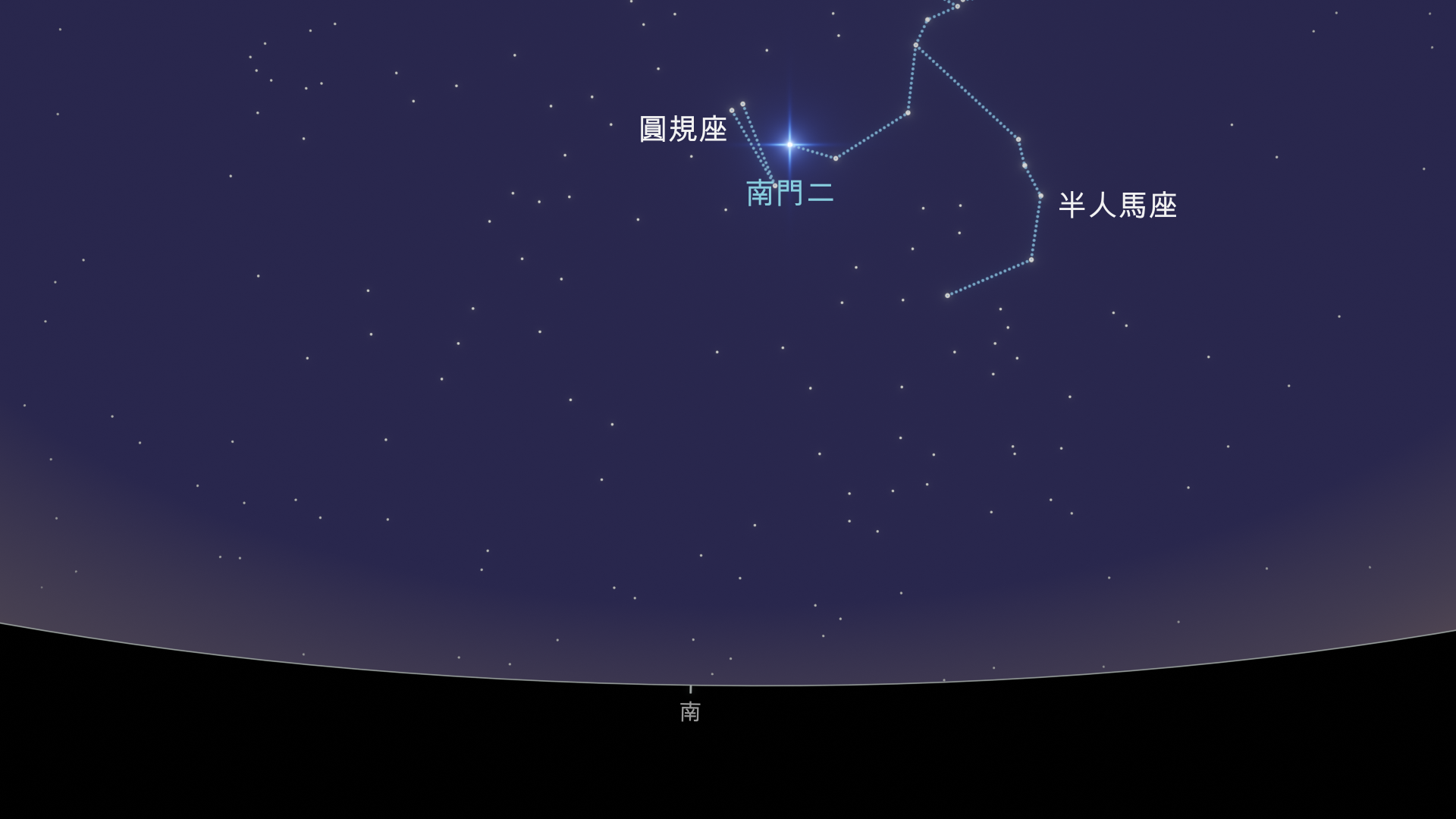 - 然後尋找半人馬座(Centaurus),從心宿二向西南方畫一條延長線,可以找到α星——南門二(Alpha Centauri,視星等-0.3)。