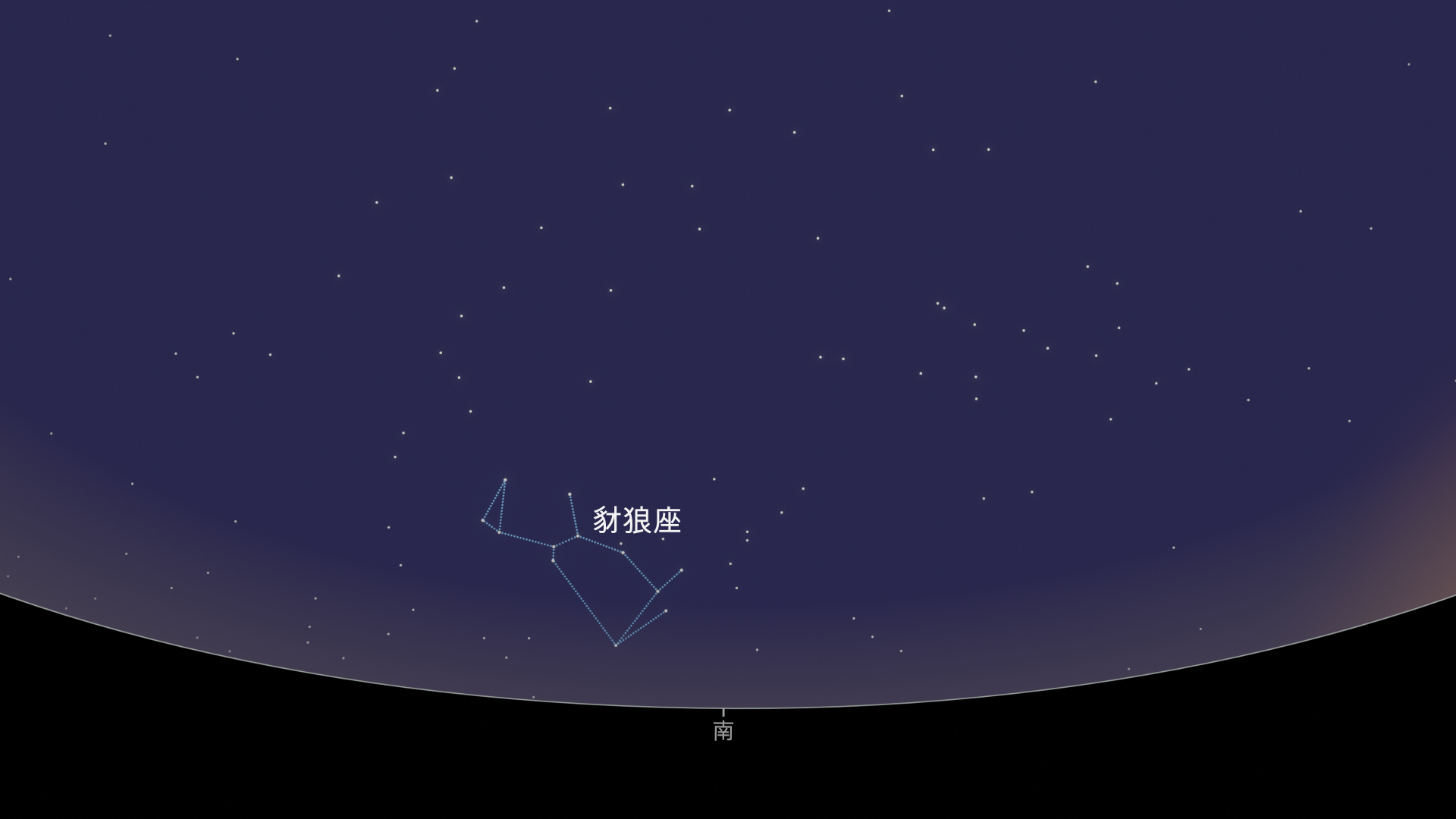 在北半球,若想看到完整的豺狼座,需要位于較靠南的地區——大致在佛羅裏達緯度或更南的位置。例如,在紐約,只有豺狼座的頂部或“頭部”部分能在六月的夜晚出現在南方地平線之上。