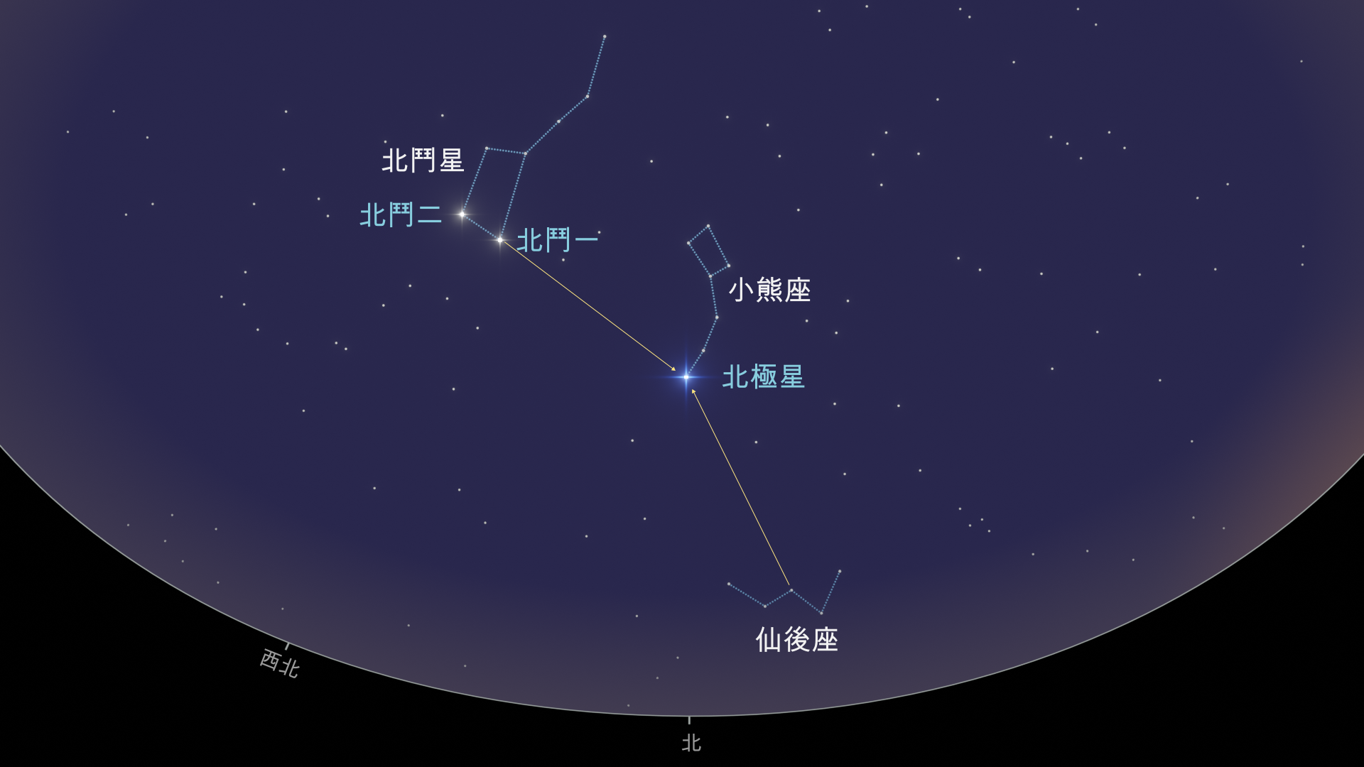 - 最亮的星:北極星(Polaris,視星等2.0)