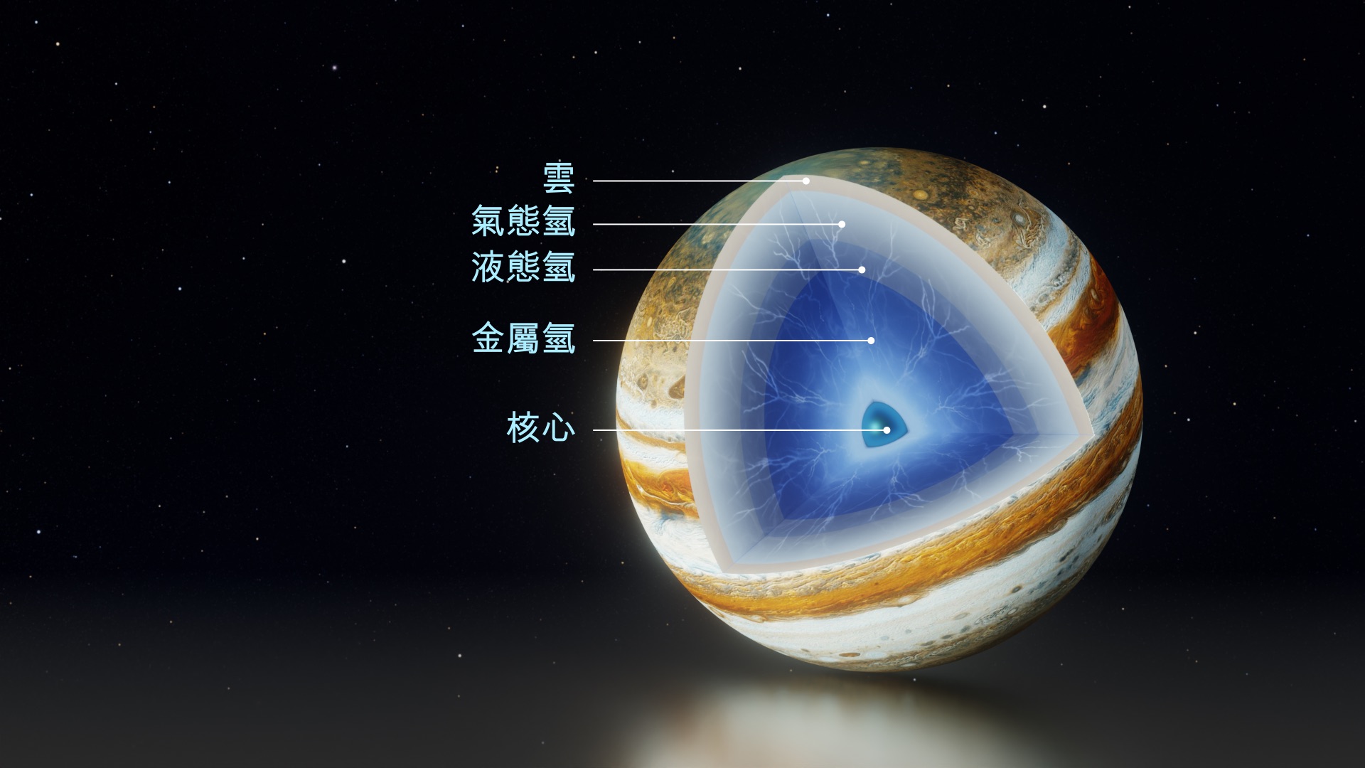 我們仍然不確定木星的核心是什麽樣子。它可能由固體物質組成,也可能是一種粘稠、沸騰的濃湯。我們所知道的是,其核心被一層液態金屬氫所包圍,這層氫延伸到行星半徑的90%。