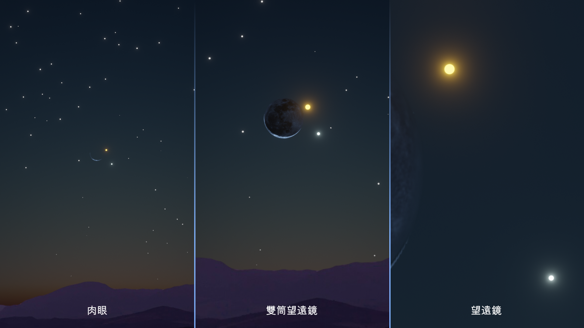 - 這三顆天體——金星、月亮與軒轅十四——肉眼即可清晰看到。它們將在晨曦中顯著可見。