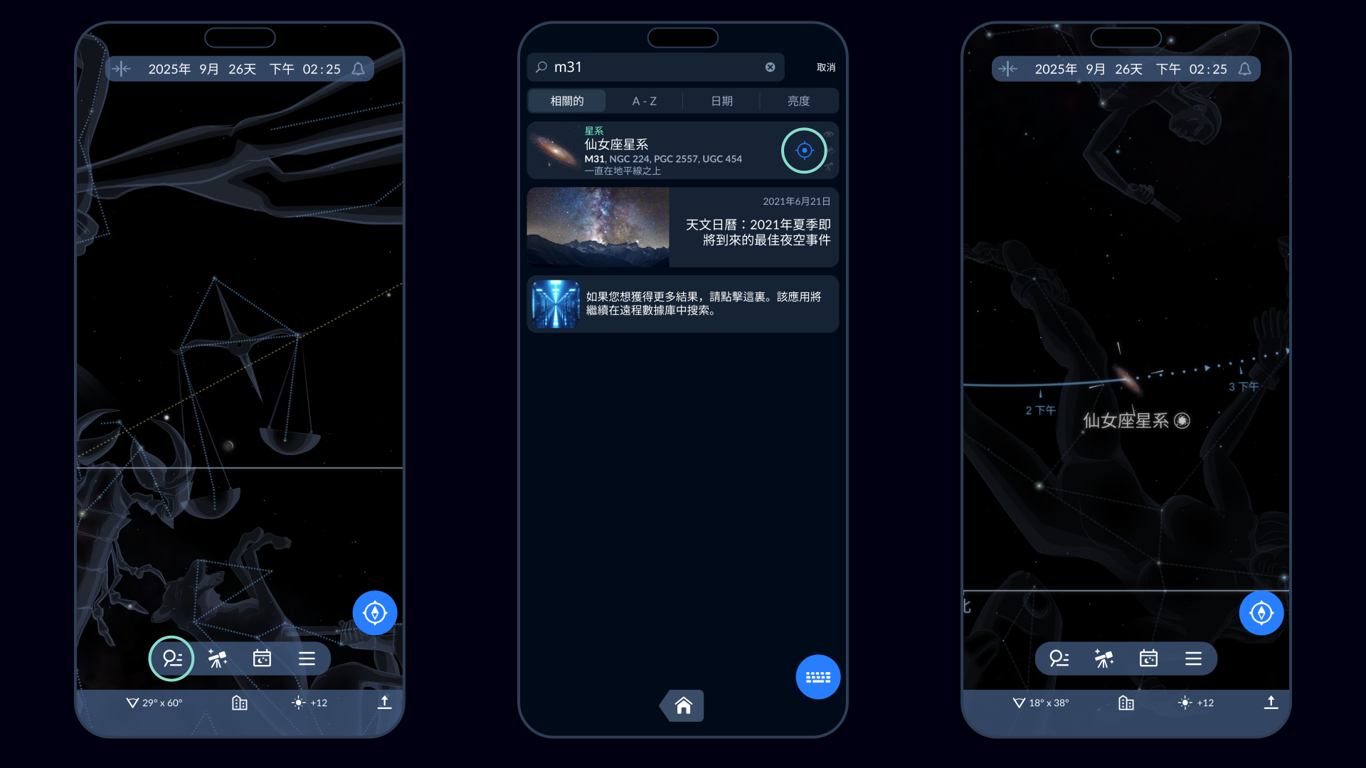 想快速找到上述任意天體,可以使用天文應用 Sky Tonight。它的數據庫包含超過90,000個深空天體,且全部免費!要找到你感興趣的目標,只需在主界面點擊放大鏡圖標,在搜索欄中輸入目標的名稱或目錄編號(例如“仙女座星系”、“M31”或“NGC 224”),然後點擊目標信息卡上的藍色目標圖標。Sky Tonight 會立即顯示該天體在你頭頂天空中的位置。