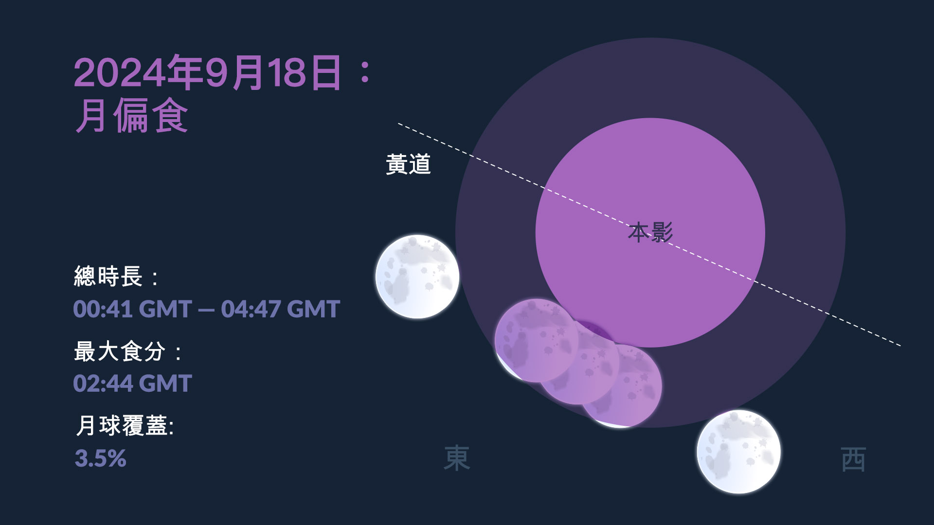 在2024年9月的月食期間,月球的一小部分(3.5%)會看起來稍微變暗,幾乎就像被咬了一小口一樣。大部分月食將呈現為半影月食,這意味著當月球穿過地球的半影時,你會看到月球的圓盤稍微變暗;當月球穿過地球的本影時,月球的一部分將被咬掉一小塊較暗的“咬痕”。