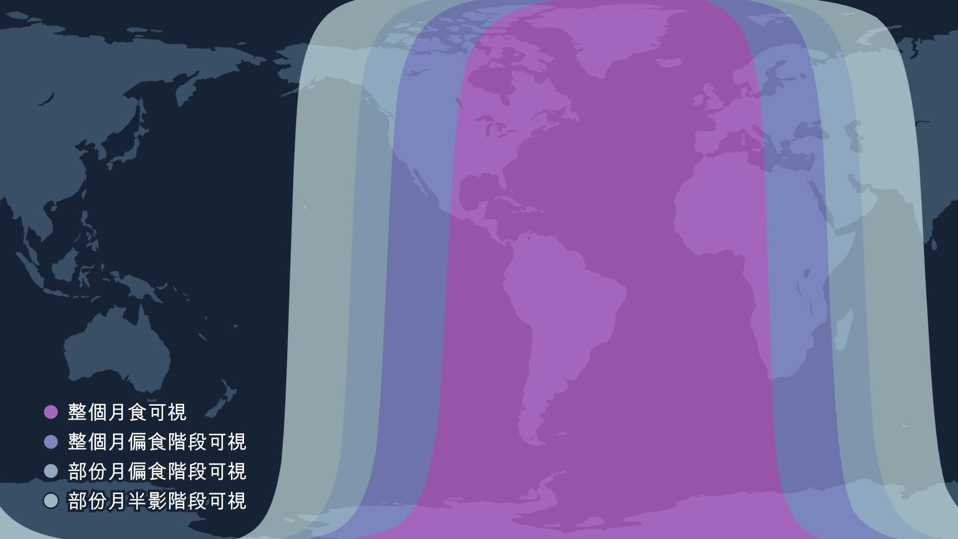 整個月食將在非洲和歐洲西部、北美南部和東部、整個南美洲和部分南極洲上空可見。