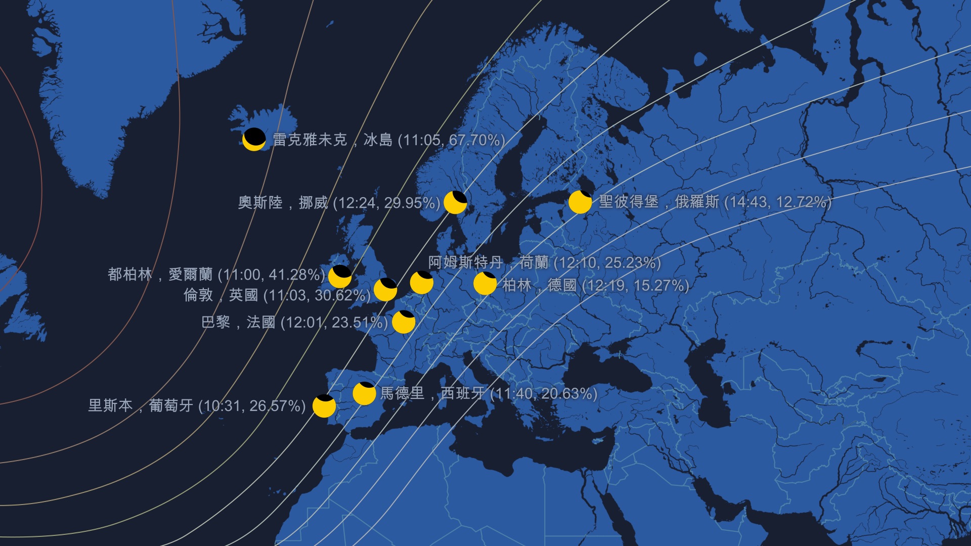 在歐洲,這次日食的觀測條件較為理想,許多地方都能看到最大食分。向西北方向移動,太陽被月亮遮擋的部分越大。因此,冰島、愛爾蘭和英國成為歐洲最佳觀測地之一。