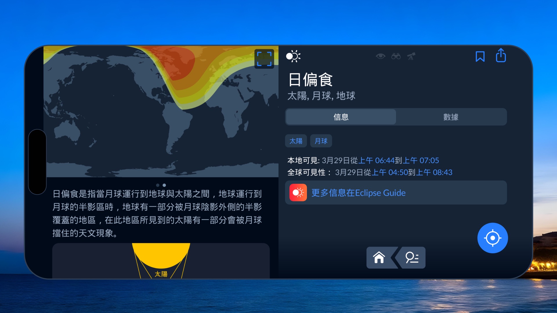 另一個優秀的日食追蹤工具是 Sky Tonight 應用程序。打開應用程序,點擊主屏幕底部的 日曆 圖標,找到 3月29日,然後選擇 日偏食 事件。在事件圖片上向左滑動,即可查看 日食地圖。要展開地圖,點擊右上角的 藍色圖標,然後可以左右拖動地圖以探索不同的觀測位置。點擊 “i” 按鈕,查看地圖圖例,了解不同顔色區域的含義。