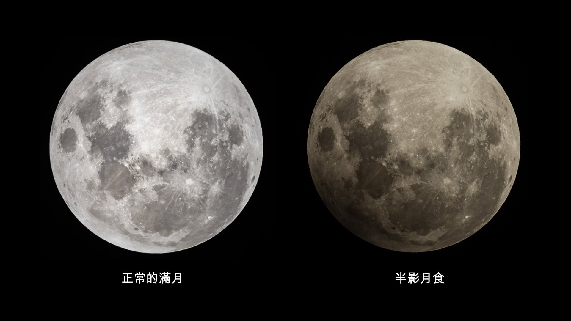 在半影月蝕期間,月亮顯得略微暗淡:肉眼幾乎看不出差異,尤其是在天空多雲或大氣受到汙染的情況下。在月蝕的中點附近,月球表面會變成更暗的褐色,而不是通常的珍珠白色。