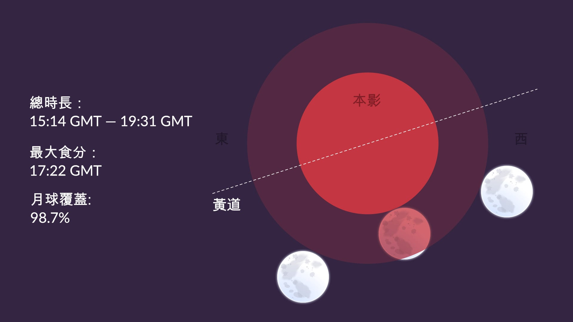 - 月蝕持續4小時18分鍾;