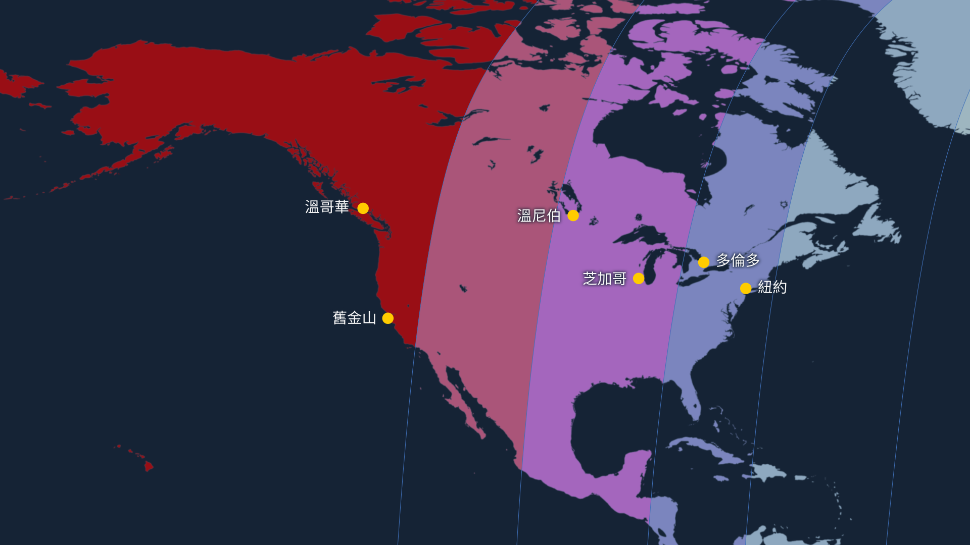 在美國和加拿大,月食的可見情況會隨著地理位置由西向東出現明顯變化: