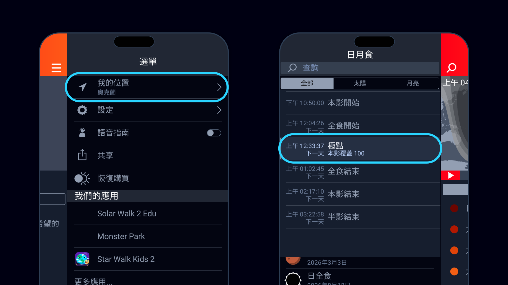 - 打開應用程式,點擊右上角的選單圖示並選擇你的位置。選定位置後,Eclipse Guide 將自動計算並顯示與你所在位置對應的精確時間及各個關鍵階段的持續時長——從不易察覺的半影階段,到全食與食甚——無需手動換算時區。