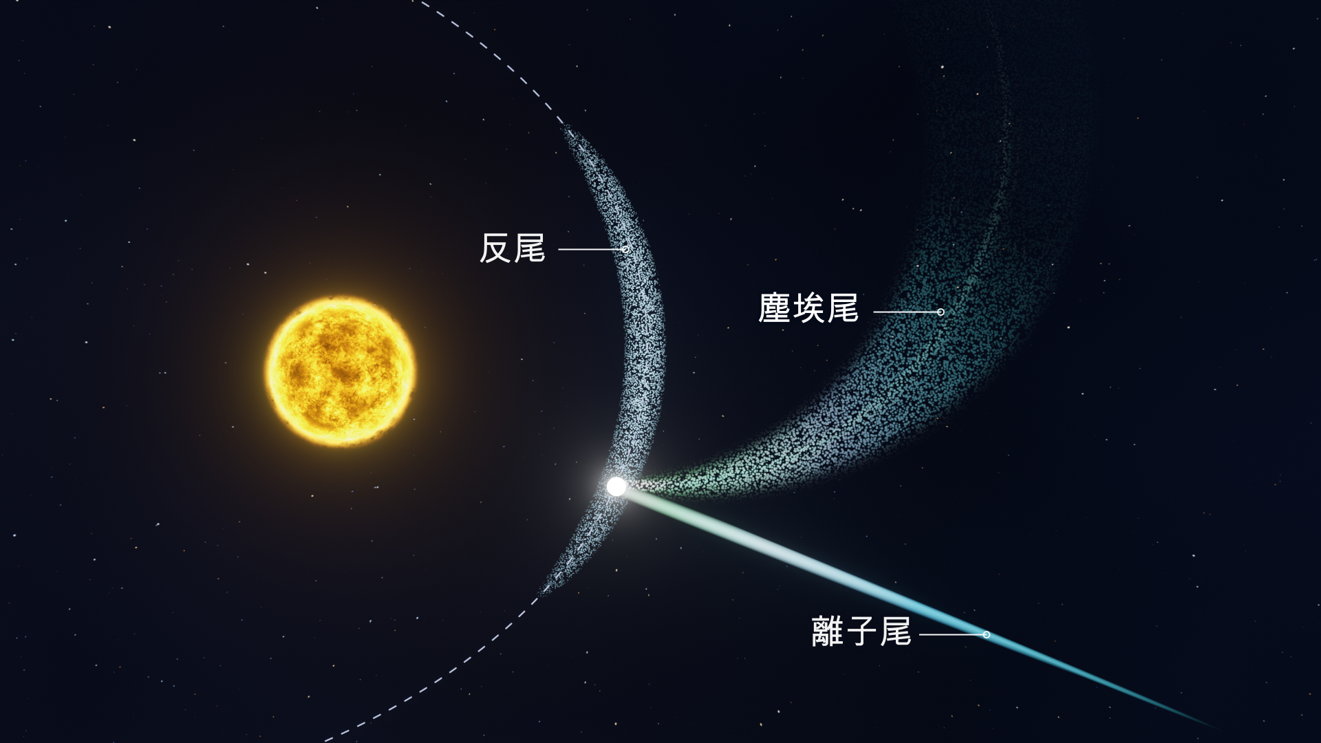 - 離子尾由帶電氣體粒子形成。它很薄且呈線性,始終指向遠離太陽的方向。