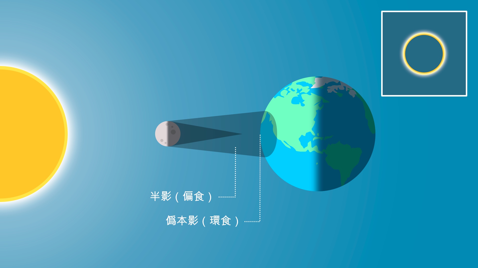 當月球在遠地點或接近遠地點時經過太陽和地球之間時,就會發生日環食。在日環食期間,月球會投射出僞本影;只有當光源的直徑大于投射陰影的物體的直徑時,才會存在這種類型的陰影。當月球遠離地球時,它的角尺寸太小而無法完全覆蓋太陽。這就是為什麽我們看到“火環”,就是黑暗月盤周圍的一圈薄薄的陽光。由于本影總是被半影包圍,因此從日環食路徑附近的地區可以看到日偏食。