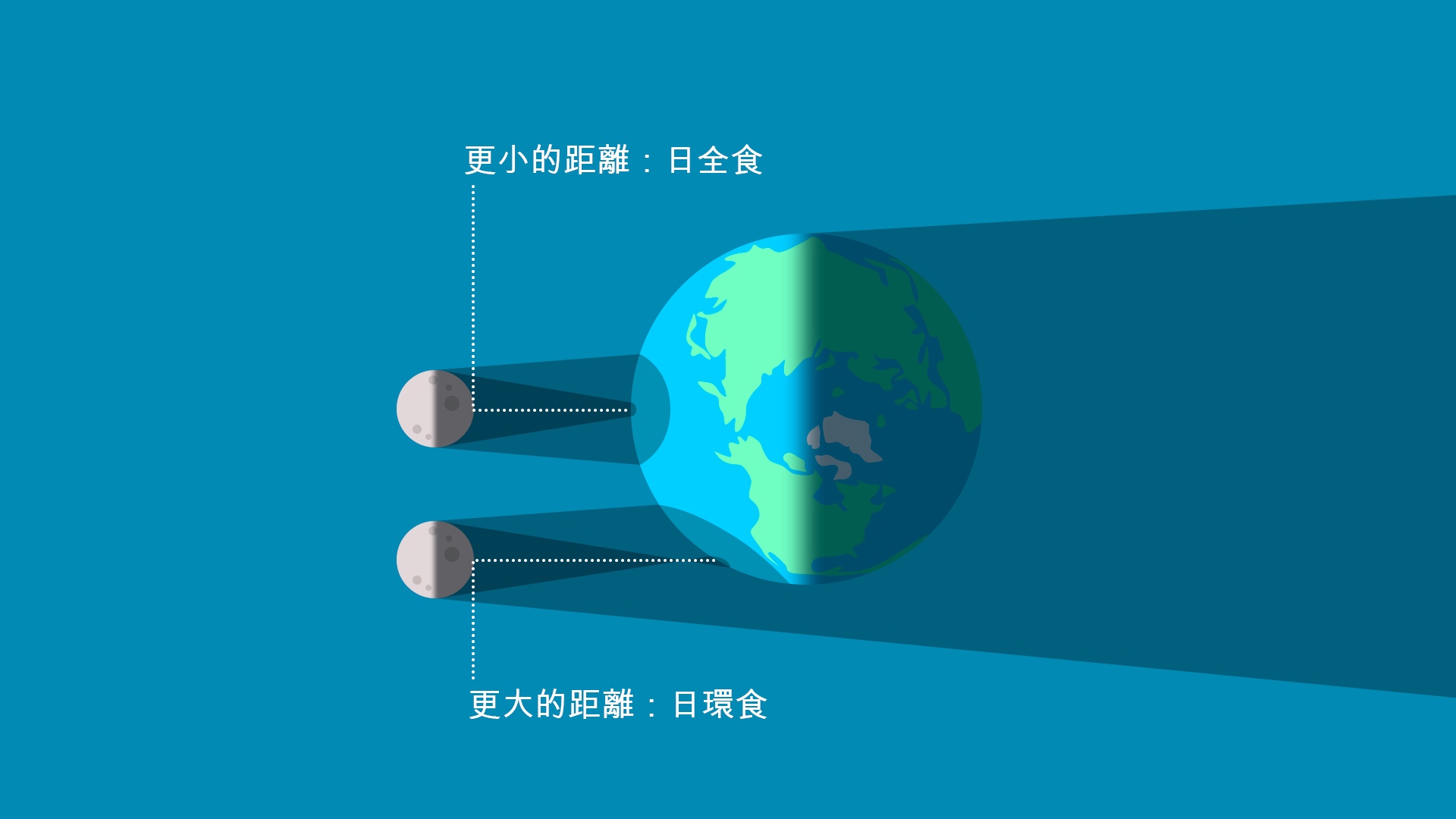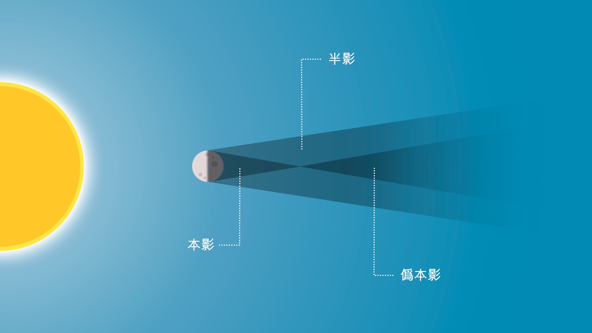 月球的影子可分為三部分:半影、本影和僞本影。我們看到的日食類型取決于陰影落在地球上的哪一個部分。