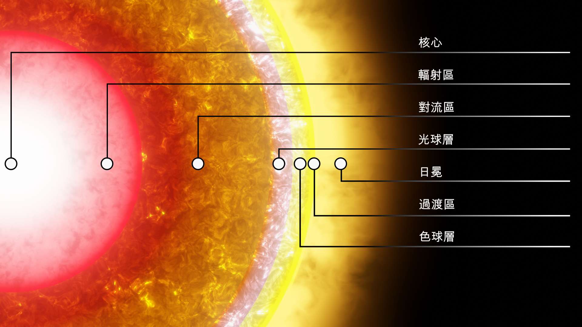 - 光球層:太陽的表觀表面,它發出大部分直接到達地球的光。