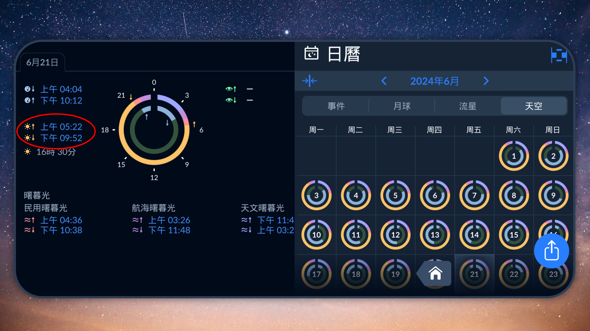如果您想了解所在城市的日出和日落時間,或訪問更具體的信息,例如民用、天文和航海黃昏時間,請查看Sky Tonight應用程序日曆。打開“天空”選項卡並選擇您喜歡的顯示格式(線條或圓形)。以藍色突出顯示的時間是交互式的:單擊它們即可查看當時天空的樣子。